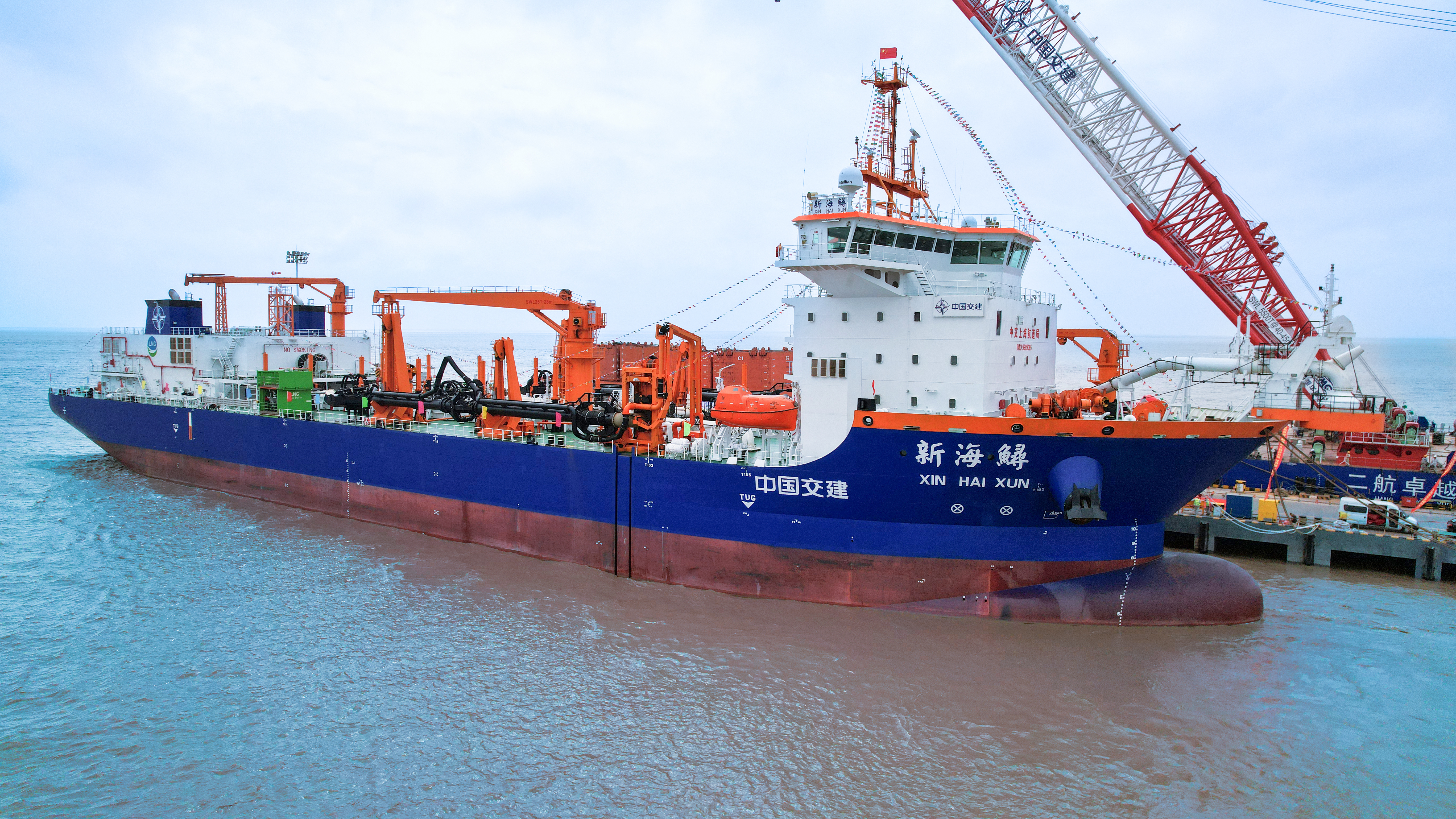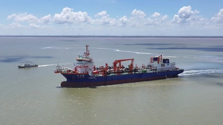 “新海鲟”轮是振华启东海工继“造岛神器”——亚洲最大重型自航绞吸挖泥船“天鲲号”之后交付的又一“疏浚重器”,是我国沿海清洁能源动力船舶营运先驱者,国产化率超90%,船舶性能、环保指标、技术水平均达到国际领先水平,交付后主要用于沿海港口、深水航道的疏浚吹填及海岸维护等工程。