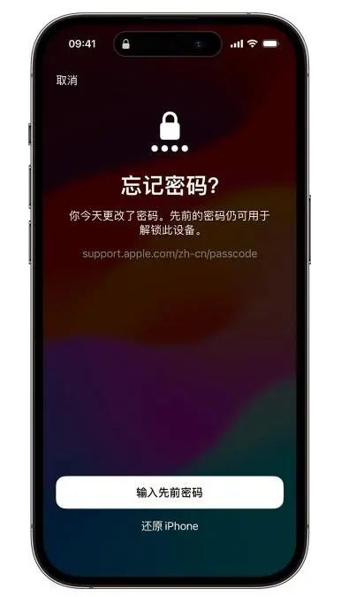 而如果手机的系统高于iOS 17,在更改密码72小时内手机不可用,还可以借助旧的手机密码来解锁手机。再次选择忘记密码,点击输入先前密码,就能解锁手机。