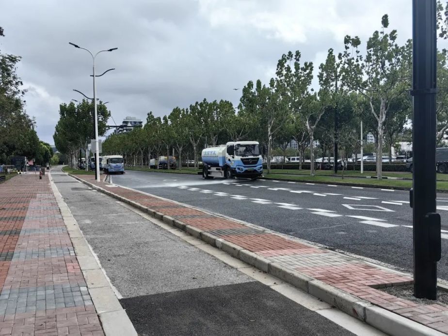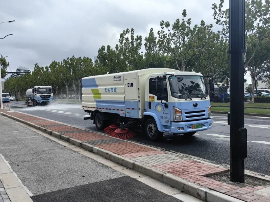 在二次处置完成后,两辆新能源洗扫车再次上阵,对道路进行最后的残液收集处置。它们通过路面清扫、洗刷、垃圾收集、污水回收等多种作业模式,确保道路无不明化学物质残留,恢复了路面的清洁与安全。