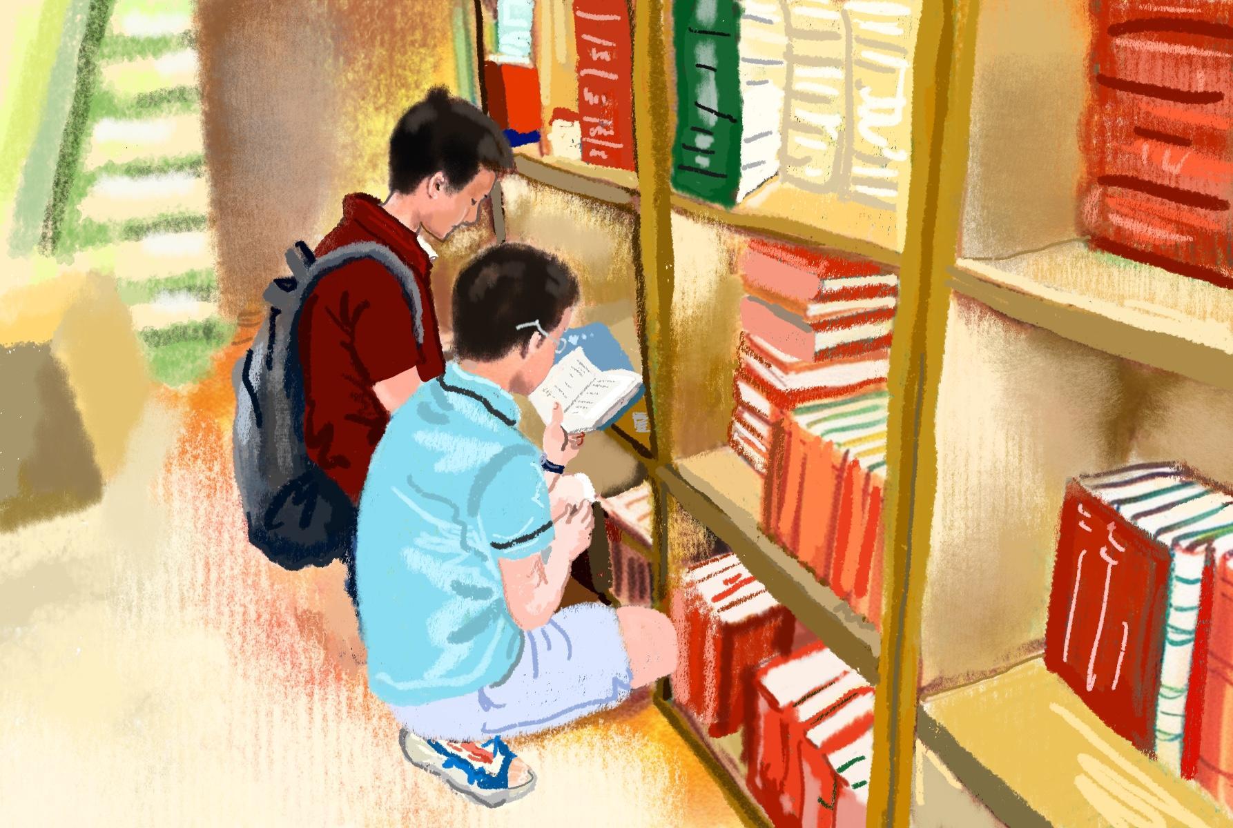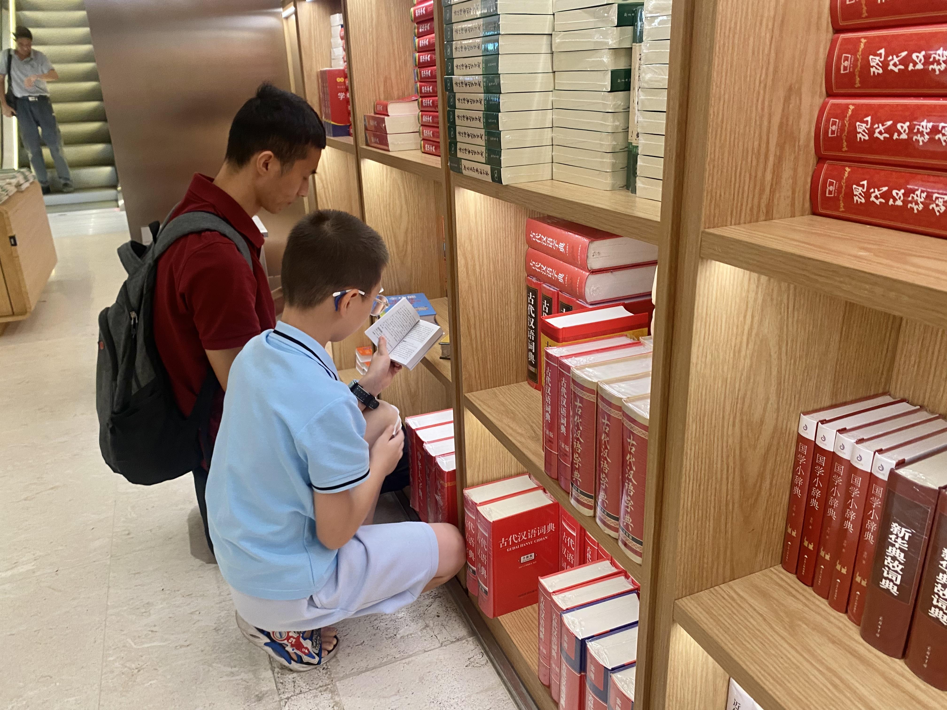 爸爸带着儿子在满墙的书柜前挑选适合的工具书。在这里,一切都是静悄悄的,是书和知识让这里按了”静音键“。无声之中,一切又有条不紊地进行着。