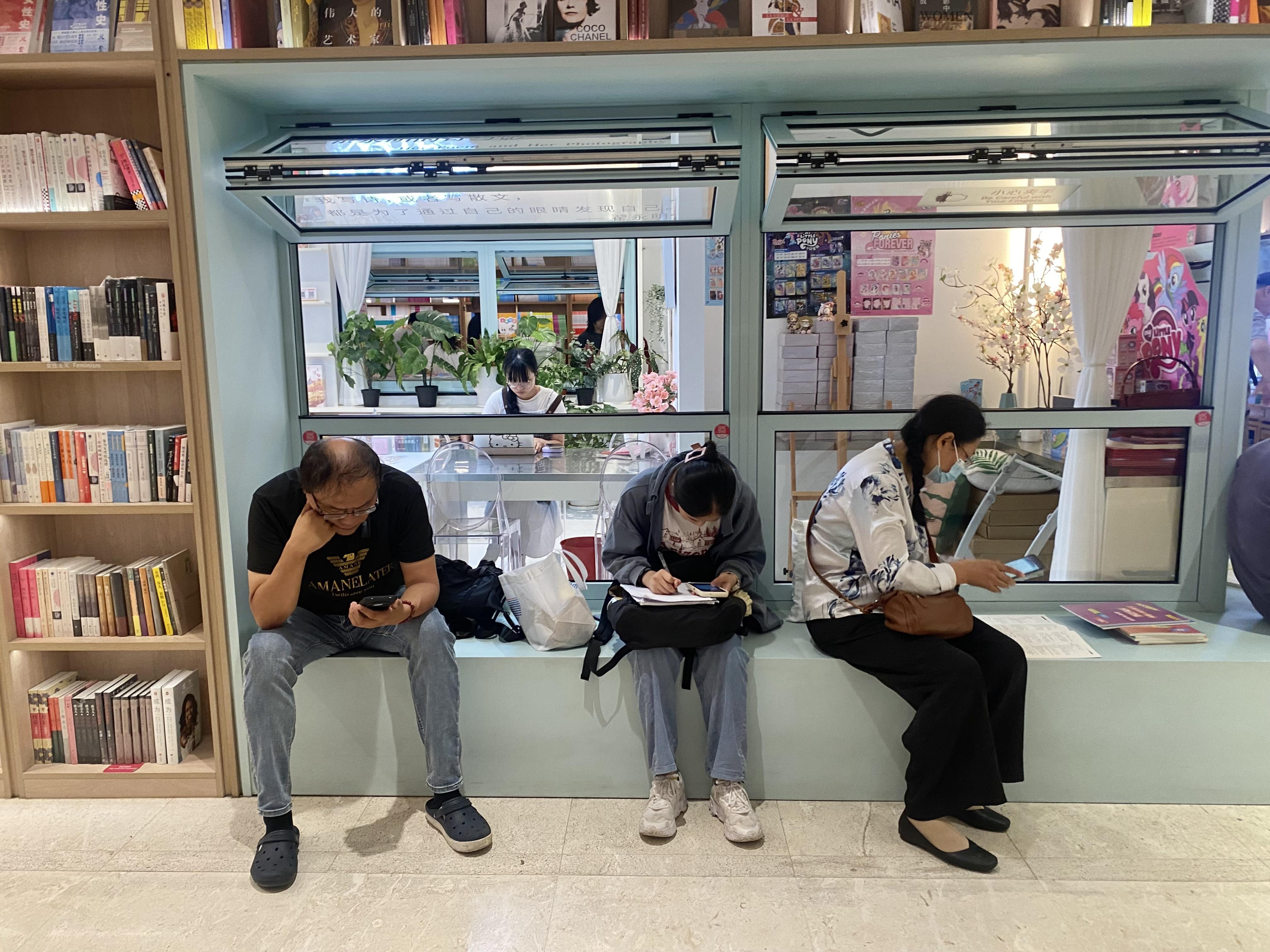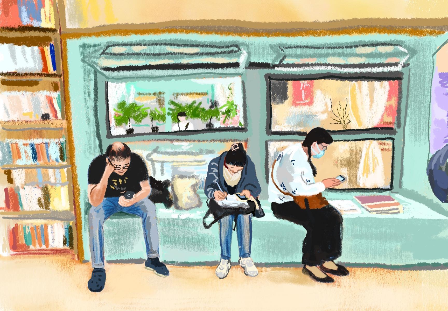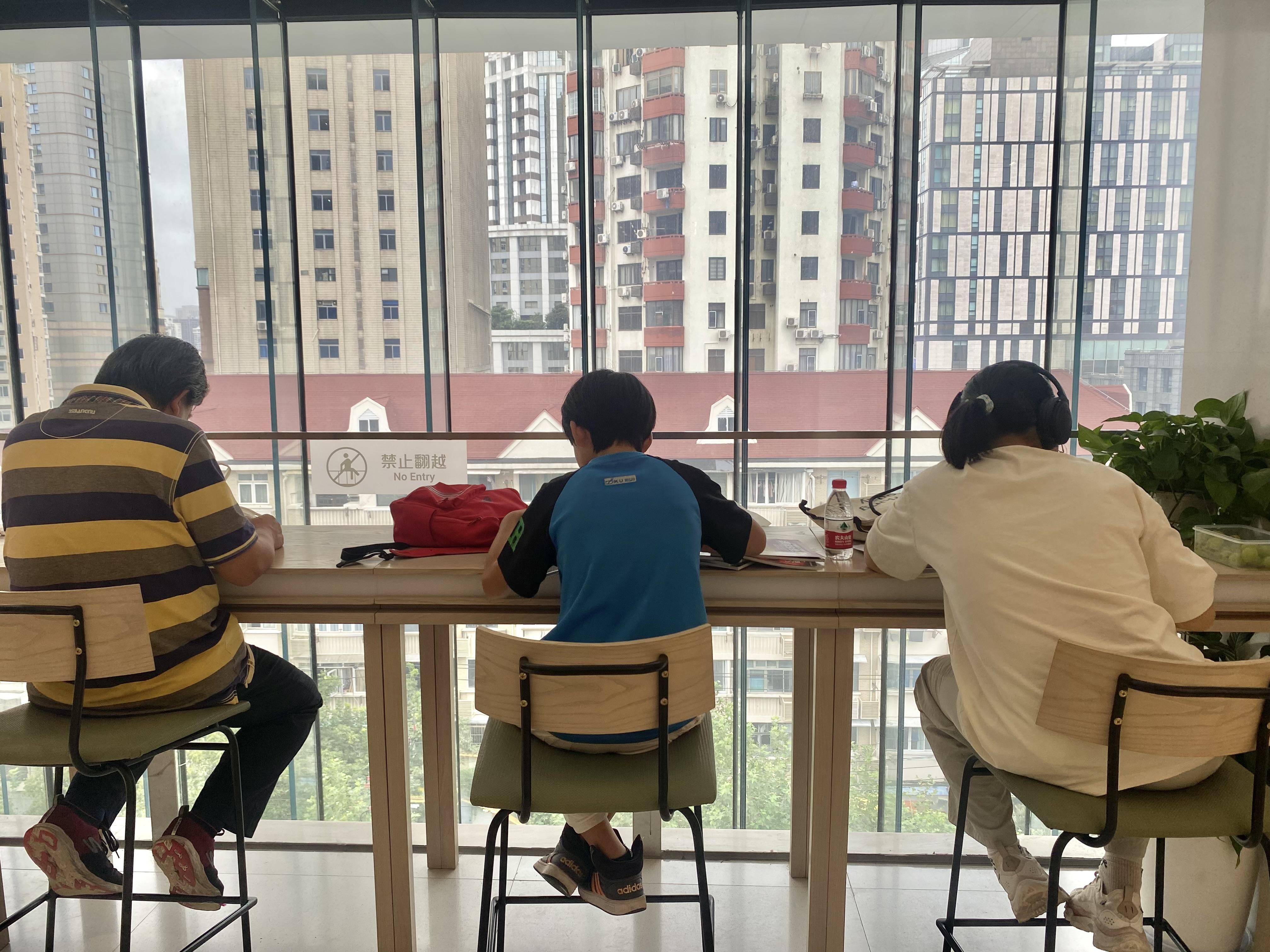 大大落地窗前,自习的年轻人和小孩子们专注地阅读着。