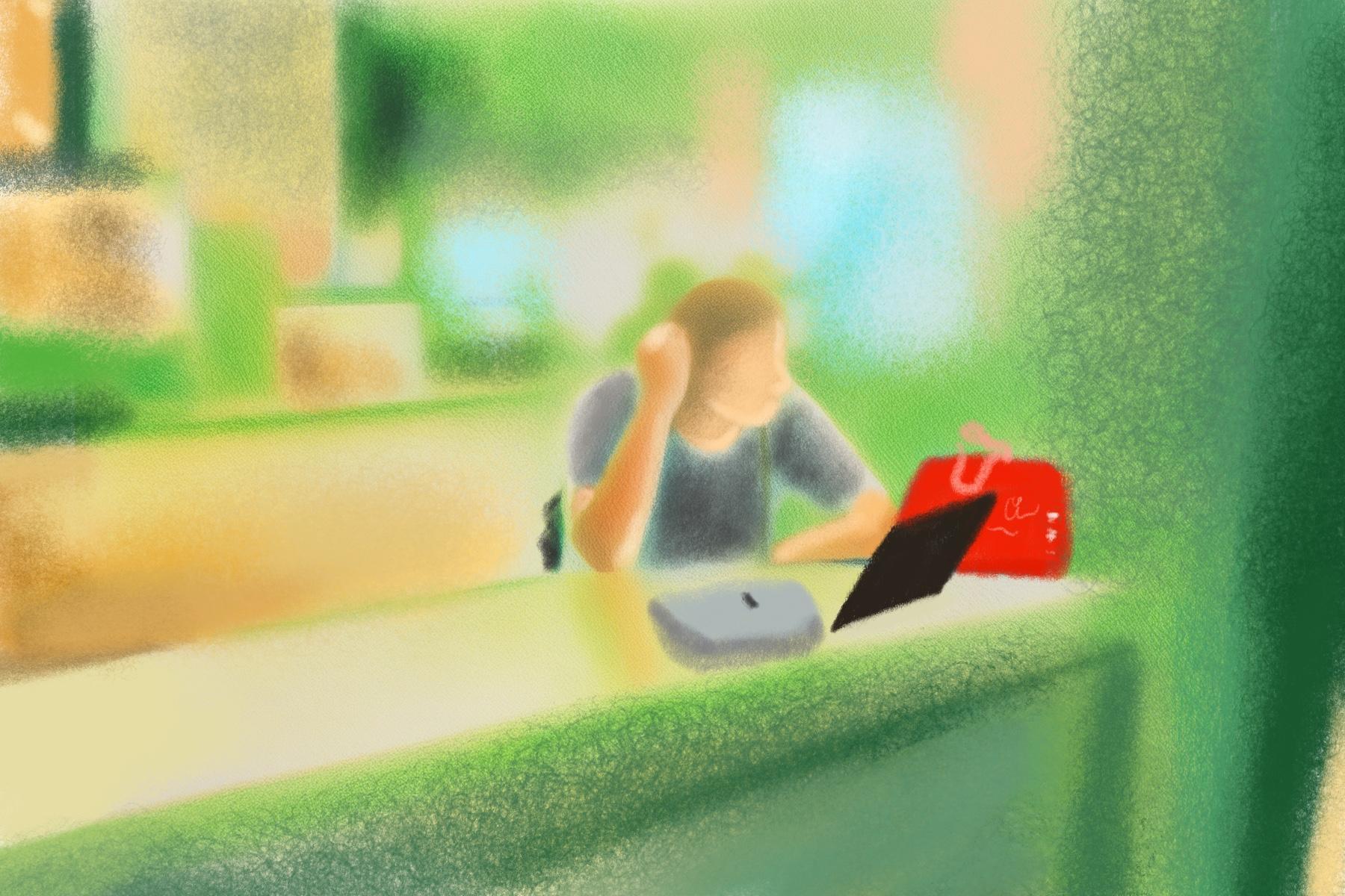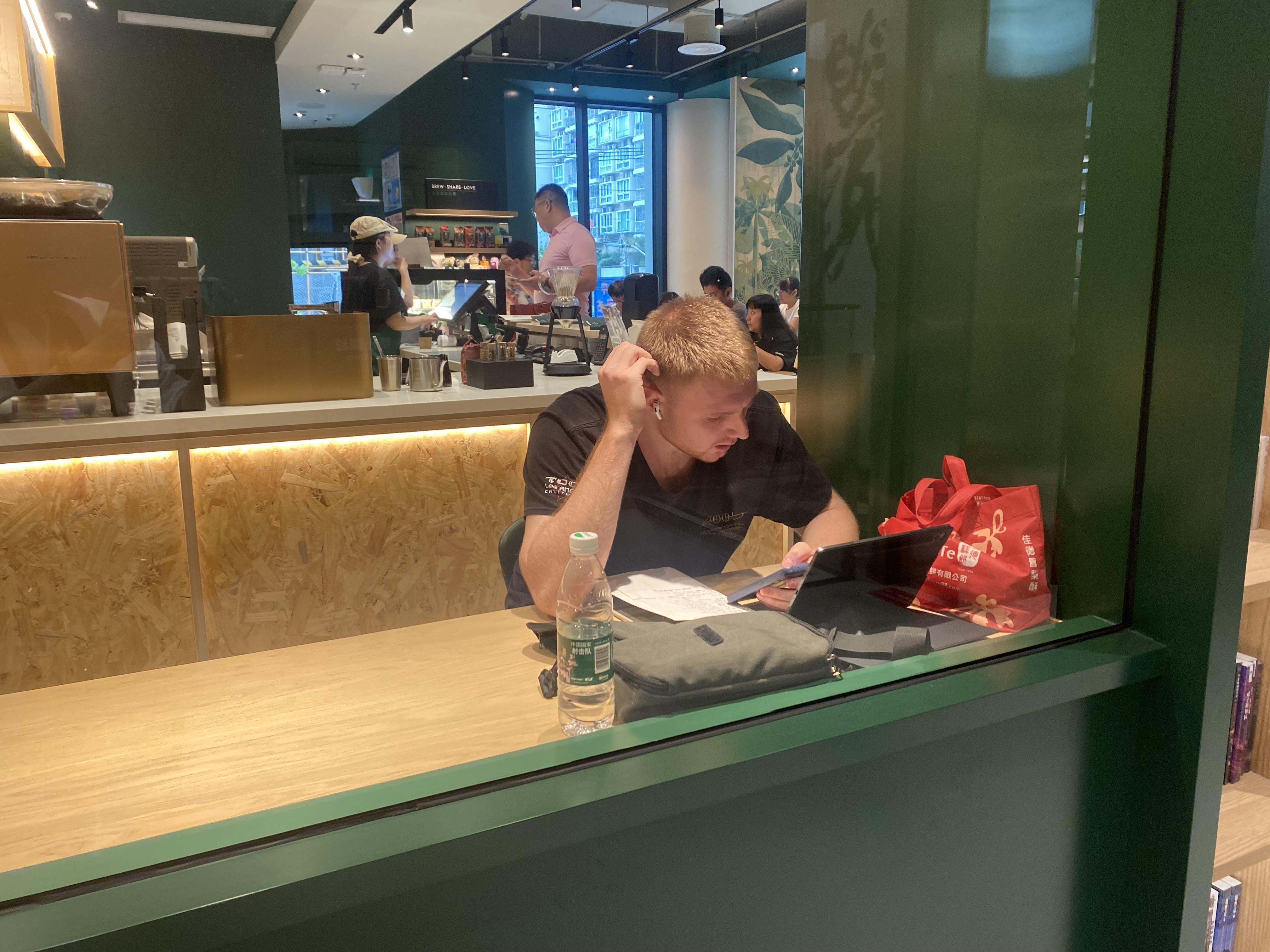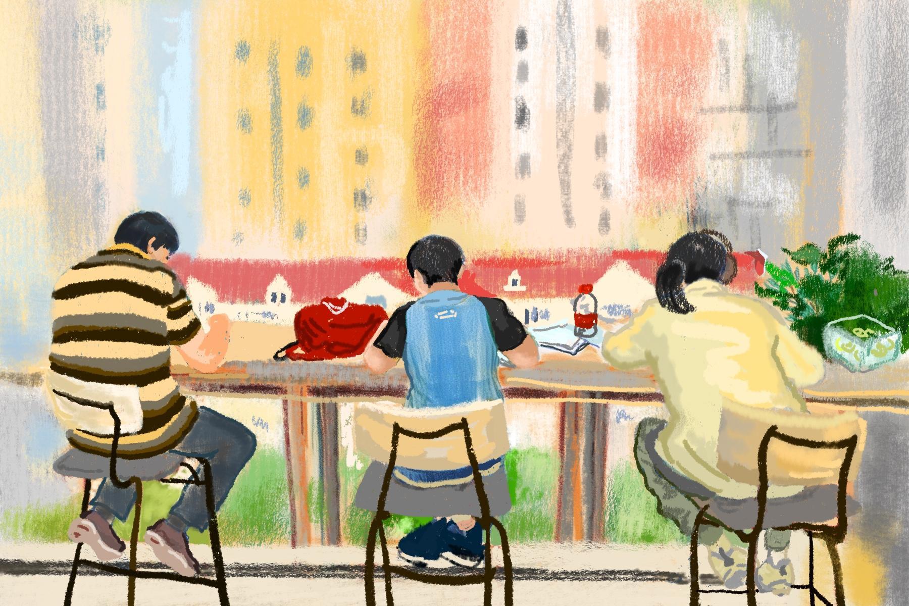 大大落地窗前,自习的年轻人和小孩子们专注地阅读着。