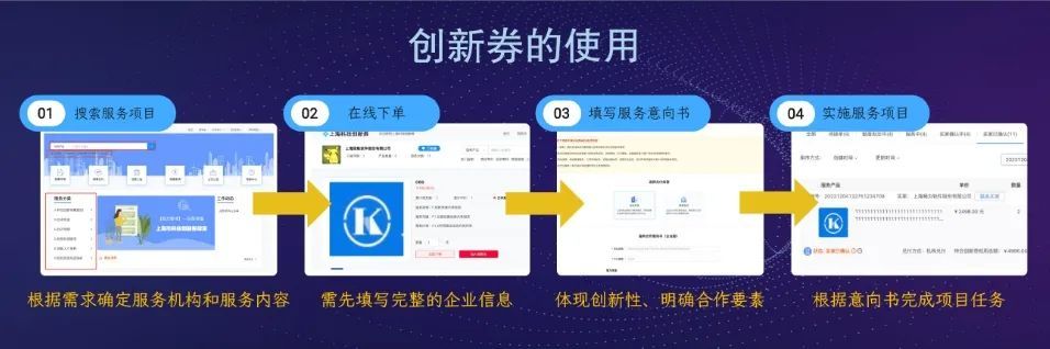 第一步,在平台搜索需要的服务机构和服务项目;第二步,下单服务项目;第三步,填写服务合作意向书;第四步,服务机构接单,开展服务。