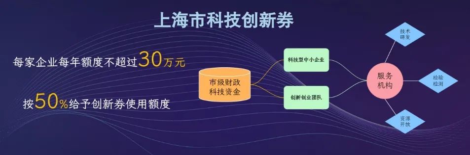 上海市科技创新券是指利用市级财政科技资金支持科技型中小企业、创新创业团队向服务机构购买技术研发、检验检测、资源开放等专业服务的一种政策工具。每家企业每年额度不超过30万元,按50%给予创新券使用额度。