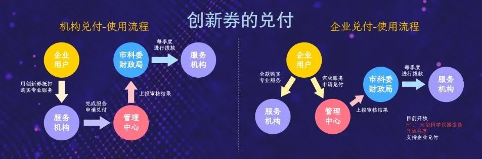 如果选择企业兑付,企业用户先全款支付服务费用,待服务完成后,由企业用户申请兑付,服务机构确认。如果选择服务机构兑付,创新券直接抵扣研发合同中的部分费用,企业用户支付剩余费用,待服务完成后,由服务机构申请兑付已抵扣的创新券额度。