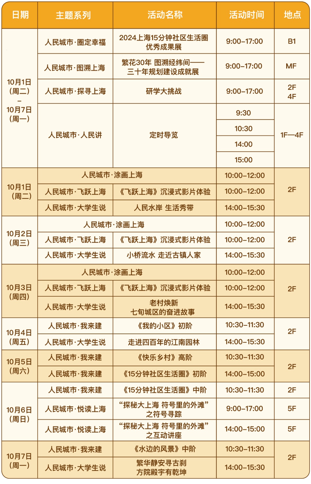 国庆节假期开放安排 根据《国务院办公厅关于2024年部分节假日安排的通知》精神,2024年10月1日(周二)至2024年10月7日(周一)为国庆节假期,上海城市规划展示馆正常对外开放,开放时间为9:00-17:00(16:00停止入馆)。 为庆祝中华人民共和国成立75周年,规划展示馆特别企划“蓝图绘就人民城市”系列活动。从主题展览到研学挑战,从科普课堂到符号探秘,活动内容精彩纷呈,邀您共同绘制美好蓝图。 国庆节假期活动日历 2024上海15分钟社区生活圈优秀成果展 “15分钟社区生活圈”是落实“人民城市”重要理念,不断满足人民对美好生活向往的生动体现,也是推进中国式现代化的积极响应和具体实践。本次展览通过三个单元、十二个赛道,集中展示2023上海“15 分钟社区生活圈”优秀案例评选的118个获奖项目、2024上海15分钟社区生活圈“人民坊”设计方案征集的147个获奖作品、以及2023年上海城市设计挑战赛“小微空间城市设计竞赛”的15个获奖作品,让市民切实感受上海历年行动成效与精品示范设计。 左右滑动查看更多 展览时间 ► 2024年9月至11月 展览地点 ► B1特展厅 参与对象 ► 入馆观众 参与方式 ► 搜索小程序“上海城市规划展示馆门票”预约入馆 繁花30年 图溯经纬间——三十年规划建设成就展 上海,这座繁华之都,在三十年里经历了巨大的变革和发展。从浦东开发到科技创新的引领,从城市基础设施的完善到文化教育的繁荣,上海的每一步发展都承载着人民的梦想和希望。本次展览通过回顾上海三十多年的城市发展历程,表达自上世纪90年代初以来上海城市发展的肌理和流动的血脉,充分展现城市建设中的规划引领、测绘保障、城档存忆。 展览时间 ► 2024年9月底至2025年1月 展览地点 ► MF共享展厅 参与对象 ► 入馆观众 参与方式 ► 搜索小程序“上海城市规划展示馆门票”预约入馆 定时导览 规划展示馆志愿者讲解团队紧紧围绕“上海2035”蓝图规划与实践,讲述上海践行“人民城市”理念的具体举措,邀你一起领略城市变迁,憧憬美好愿景。 参与对象 ► 入馆观众 参与方式 ► 搜索小程序“上海城市规划展示馆门票”预约入馆 详情至1F服务中心咨询 “探秘大上海 符号里的外滩”主题活动 一卷泛黄老地图,轻启时光之门,邀你共赴一段跨越世纪的奇幻旅程。在字里行间与尘埃之间,隐藏着无数谜题,等待着你一一解开。 规划展示馆携手上海社会科学院出版社,合作推出“探秘大上海 符号里的外滩”主题活动,以建筑为线索,以符号为钥匙,解密外滩建筑背后的故事。 在历史记忆里踱步,在多维时空中徜徉。一场叩问时空,专属于你的探秘之旅,即将开启! 点击查看:人民城市·悦读上海——“探秘大上海 符号里的外滩”主题活动开启报名 研学大挑战 嘿! 小小探险家们,准备好开启一场奇妙的研学之旅了吗?探索优秀历史建筑,领略海派文化魅力;解锁“生态之城”愿景,感受绿色发展规划。双主题研学活动等你来挑战! 点击查看:研学大挑战第一弹——优秀历史保护建筑 研学大挑战第二弹——生态之城将于国庆假期上线。 参与对象 ► 建议7-14岁 参与方式 ► 搜索小程序“上海城市规划展示馆门票”预约入馆 详情至1F智慧服务小站咨询 《上海城市建筑》系列科普课堂 规划展示馆携手同济大学建筑与城市规划学院、Uptown Lab团队共同呈现《上海城市建筑》系列科普课堂,一起品味上海建筑。为提升课程互动性与趣味性,在部分课程中设置了手作环节,在动手实践中加深对建筑设计的理解。 左右滑动查看更多 参与对象 ► 建议7-12岁 参与人数 ► 30人/场 活动地点 ► 2F城市实验室 报名链接 ► 请扫描下方二维码报名 友情提示:为保证课程效果,课程开始时即停止签到,迟到者将取消参与资格。 “城市实验室”课程 规划展示馆品牌项目“城市实验室”,国庆假期将开放五场数字实验课程,邀请孩子们一起大开脑洞,组团挑战城市规划建设中的难题,探索城市发展的各种可能! 参与对象 ► 7-14岁 参与人数 ► 36人/场 活动地点 ► 2F城市实验室 参与方式 ► 请扫描下方二维码报名 友情提示:为保证课程效果,课程开始时即停止签到,迟到者将取消参与资格。 拿起画笔,描绘出孩子们心中的上海,用创意与想象,为这座城市注入无限活力。 参与对象 ► 建议3岁以上 参与人数 ► 24组家庭/场 活动地点 ► 2F城市实验室 参与方式 ► 现场报名 《飞跃上海》沉浸式影片体验 《飞跃上海》是一部全方位展现上海之美的影片,通过独特的镜头语言,带您见证一座人文、创新、生态之城,感受这座城市的深厚历史底蕴与蓬勃生机。 <人文上海> <创新上海> <生态上海> 参与对象 ► 入馆观众 参与人数 ► 40人/场 活动地点 ► 2F城市实验室 参与方式 ► 现场报名 (来源:上海城市规划展示馆)