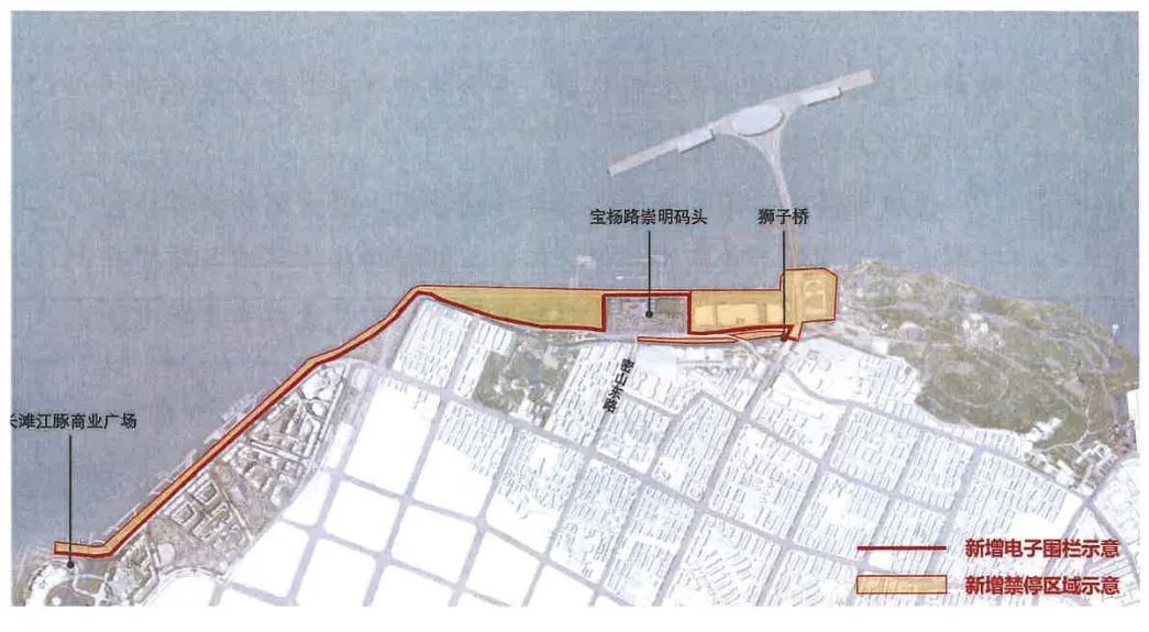 2、密山东路至滨江公园最北端路段:在吴淞口路东侧滨江公园及绿化范围(不包含宝杨路崇明码头)设置电子围栏。