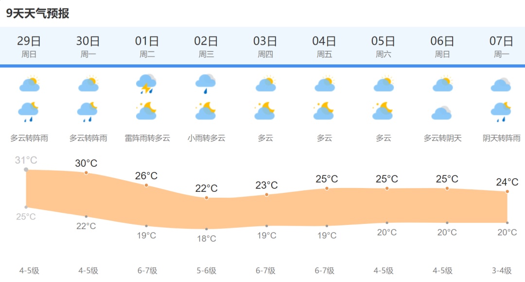 今天(9月29日)天气以多云为主,局部地区迎来短时小雨。今日气温再上一层楼,空气湿度也不低,全天气温在24~31℃之间,相对湿度95%
