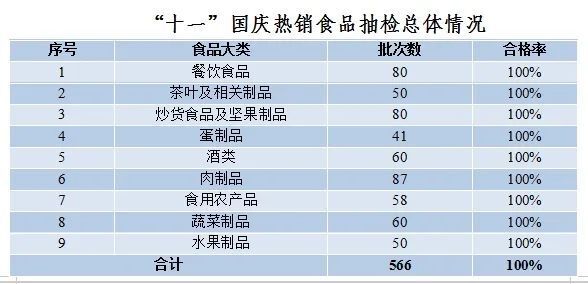 针对节日消费特点,此次专项抽检聚焦旅游景点及其周边、热门消费商圈、餐饮服务单位以及大型商超、批发市场等重点场所、重点环节,抽检肉制品、炒货食品及坚果制品、酒类、蔬菜制品、茶叶及相关制品、水果制品、蛋制品、餐饮食品和食用农产品等9大类重点食品,共566批次,合格率100%。