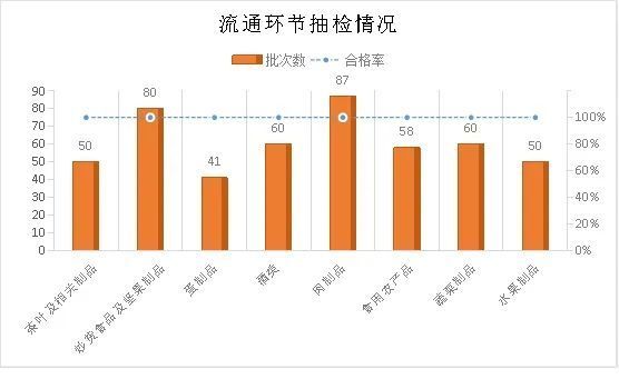 流通环节抽检情况:专项抽检覆盖麦德龙、盒马鲜生、苏果超市、良品铺子、来伊份、众彩、天河等各类商超、农贸市场和批发市场等重点场所销售的肉制品、炒货食品及坚果制品、酒类、蔬菜制品、茶叶及相关制品、水果制品、蛋制品和食用农产品等486批次,合格率100%。