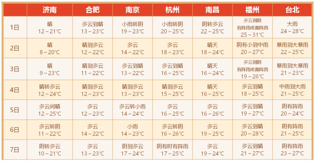 国庆假日期间华东北部地区以多云天气为主;华东中部1—2日受冷空气影响,有一次大风降温和降水过程,假日后期还将有一次降水过程;华东南部受台风外围影响,1—3日有阵雨或雷雨。