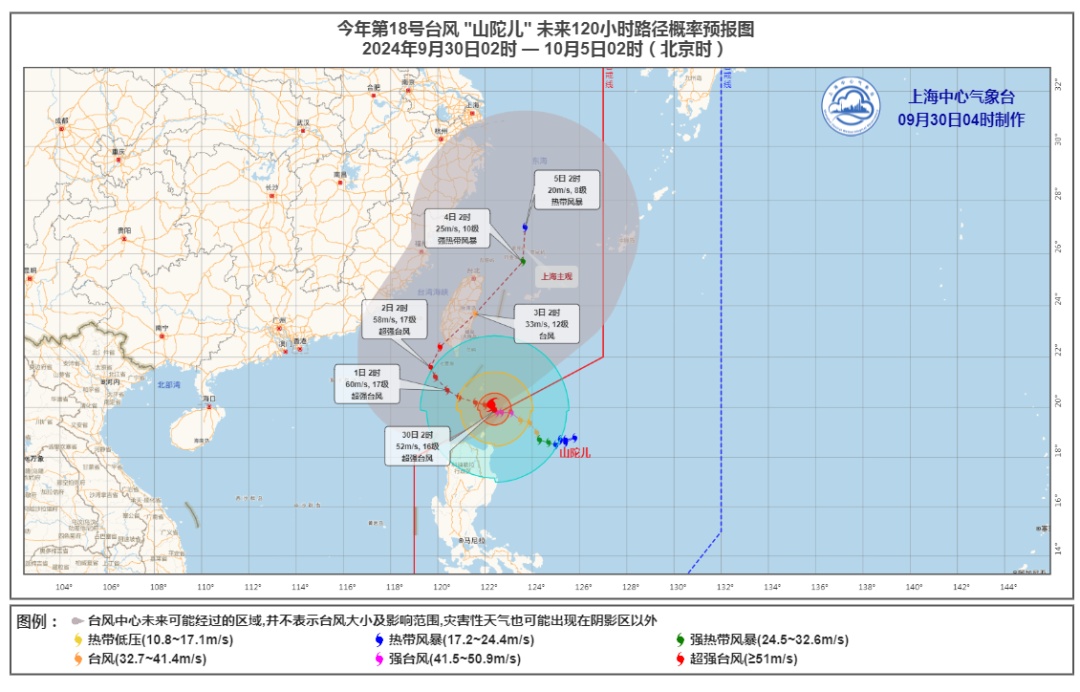 今年第18号台风“山陀儿”今天5时中心位于距离台湾省鹅銮鼻东南方向约270公里的西北太平洋洋面上,为超强台风级。预计,“山陀儿”将以每小时10公里左右的速度向西偏北方向移动,强度逐渐增强,之后逐渐向我国台湾岛南部沿海靠近。将于10月1—2日登陆(或擦过)台湾岛,强度减弱,并转向北偏东方向移动。2日后期到3日早晨进入东海海域,上海逐渐受到其外围环流影响。