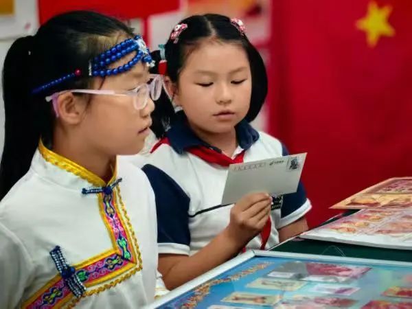 活动现场,有声明信片里传出西藏日喀则、青海果洛、新疆喀什以及云南少数民族的声音,讲述着“石榴籽一家亲”的故事。御桥小学仝予菡、张悠然、母霄然等少数民族学生,向伙伴们介绍了回族、蒙古族等民族的习俗,分享了自己的集邮经历。来自蒙古族的张悠然展示了家乡丰富多彩的文化,从服饰、饮食到歌舞、节庆。她介绍的一枚邮票设计巧妙融合蒙古族传统元素与现代审美,展现了全国各族人民心手相连、共同奋斗的美好愿景。