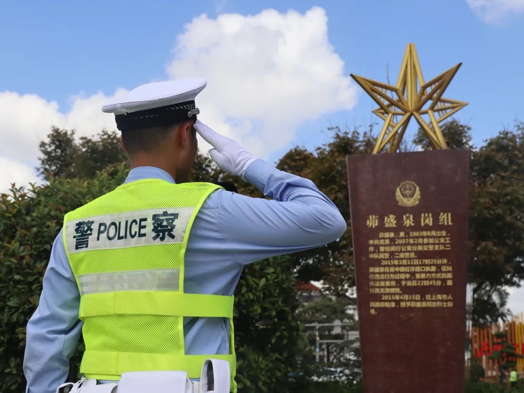 在第11个国家烈士纪念日前夕,闵行交警支队的青年民辅警和辖区虹桥派出所的民警代表来到吴中虹许路口的“茆盛泉岗组”纪念碑前肃立默哀,敬献鲜花,缅怀这位青年民警。