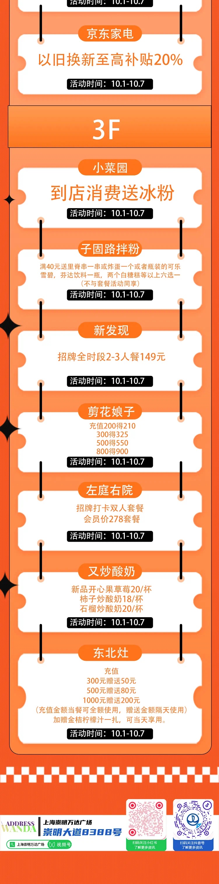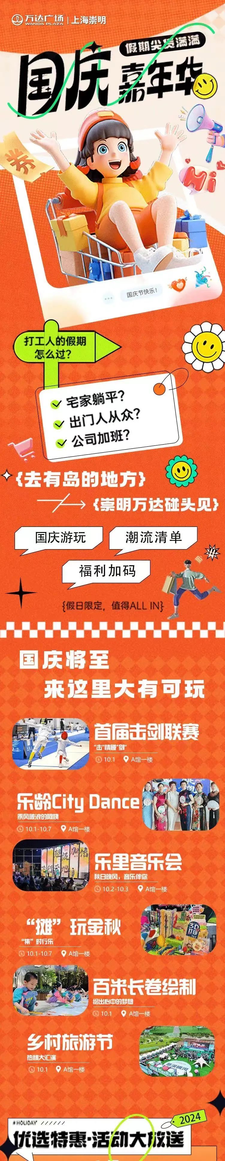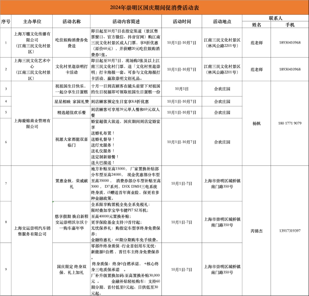 令人期待的国庆长假即将到来,崇明各大商超、集贸市场、住宿餐饮业等商业主体抢抓节日消费热点,围绕“游购玩乐”内容,组织开展一系列精彩纷呈的促消费活动,积极营造浓郁的节日消费氛围。