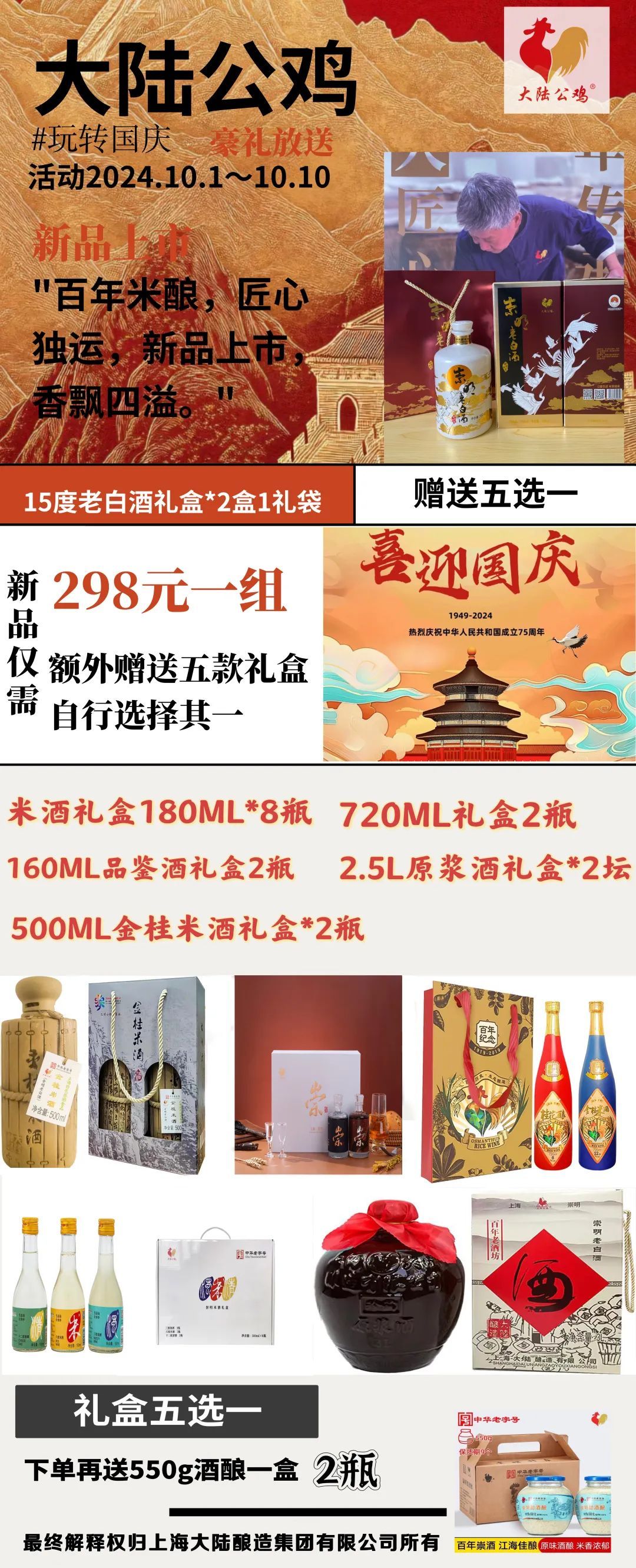 2.购新品15度550老白酒一组(2组)送550酒酿礼盒一组(2瓶),再送价值100元以上的伴手礼盒(五选一);