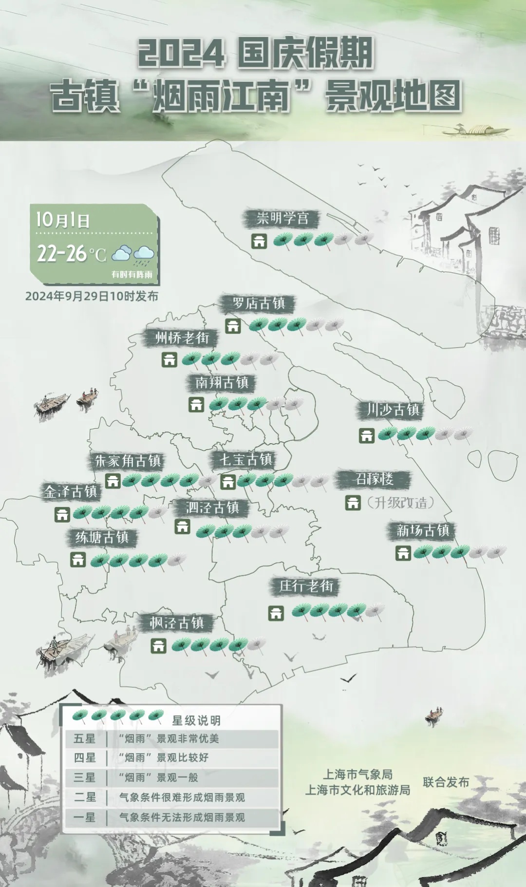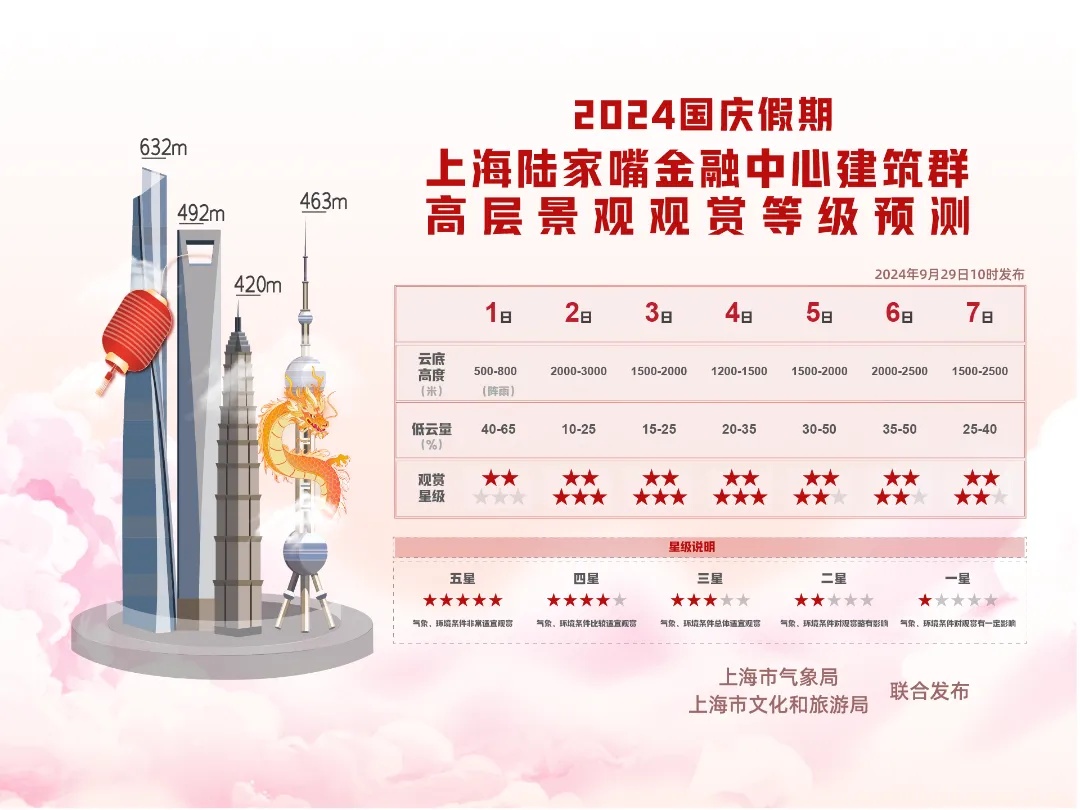 国庆期间,上海天气总体适合出游。特别是假期中段,天气晴好、气温适中,无高影响天气。假期头尾有降水过程,气温先降后升,1-3日风力较大。