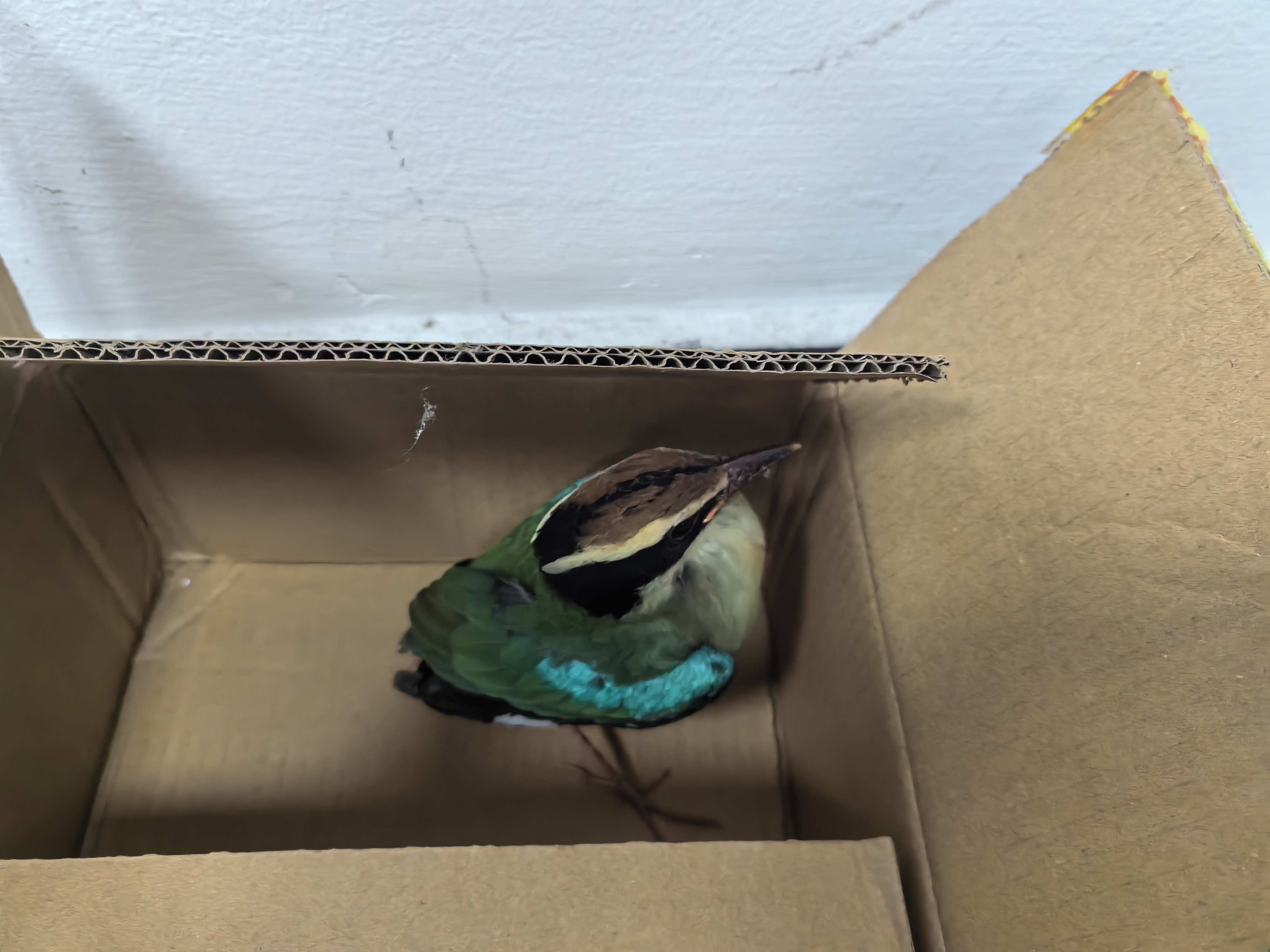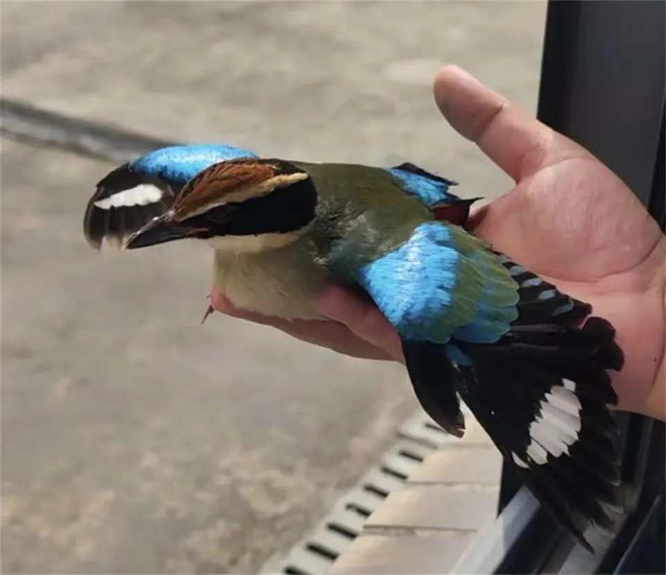 通过仔细检查,民警发现该鸟翅膀受伤,不能正常起飞,为避免其受到二次伤害,民警将其小心翼翼安置在纸箱里,并立即联系区林业部门,请对方提供专业救助。经区林业部门工作人员仔细比对,确认该鸟是仙八色鸫,为国家二级保护野生动物。