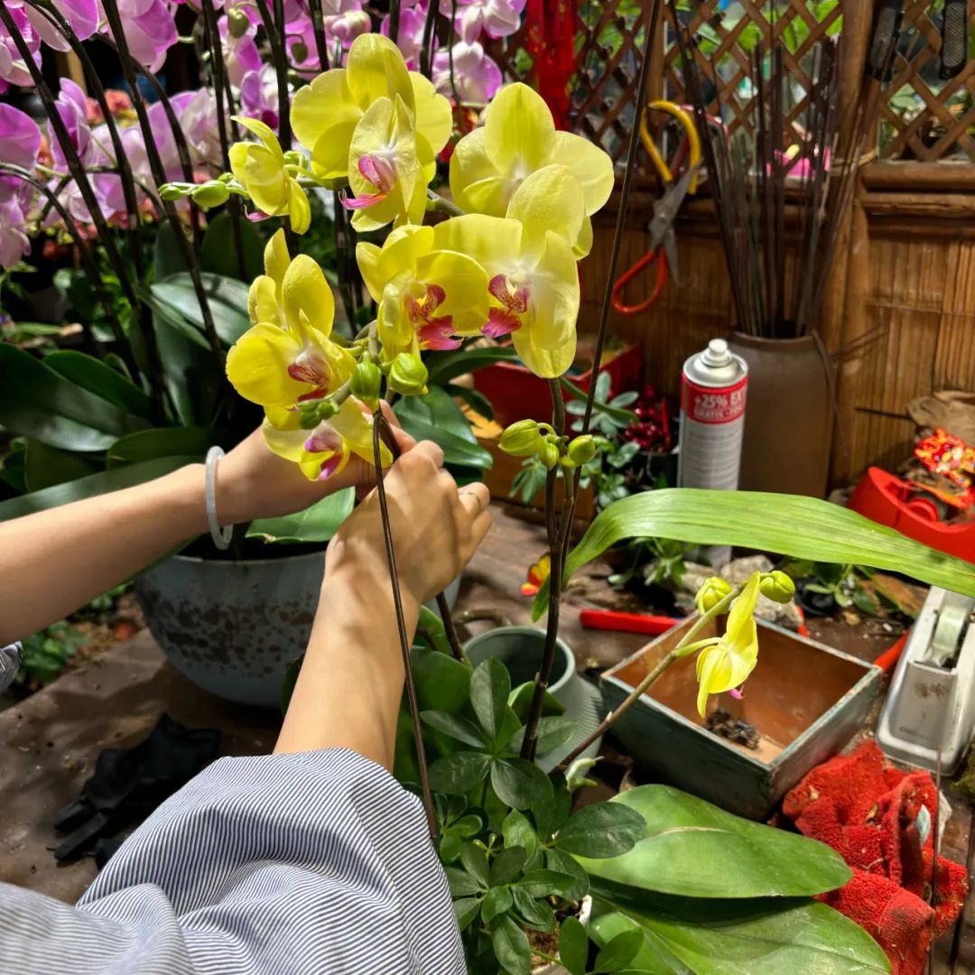 “蝴蝶兰是一种招财花,国庆期间走亲访友很适合用来送礼,象征着幸福。花期大约为2—3个月,存放条件不讲究。”蒯兰蝴蝶兰店店员说,“我现在是将一小株一小株的蝴蝶兰组装到大的花盆里,顾客想要几株、想要什么颜色、想要什么样的花盆都可以自己选择,刚刚一位阿姨买的就是黄色的蝴蝶兰。”