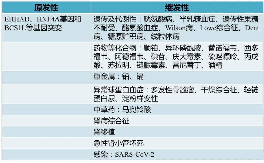 肾小管按照结构部位划分,分为近端肾小管、细段、远端肾小管和集合管。不同部位的肾小管功能不一,但近端肾小管是实现物质重吸收的主要区域,该处的功能若广泛失灵,则会引起一种少见的疾病,即范可尼综合征(Fanconi syndrome)。迄今,发现范可尼综合征的原因众多,具体见下表: