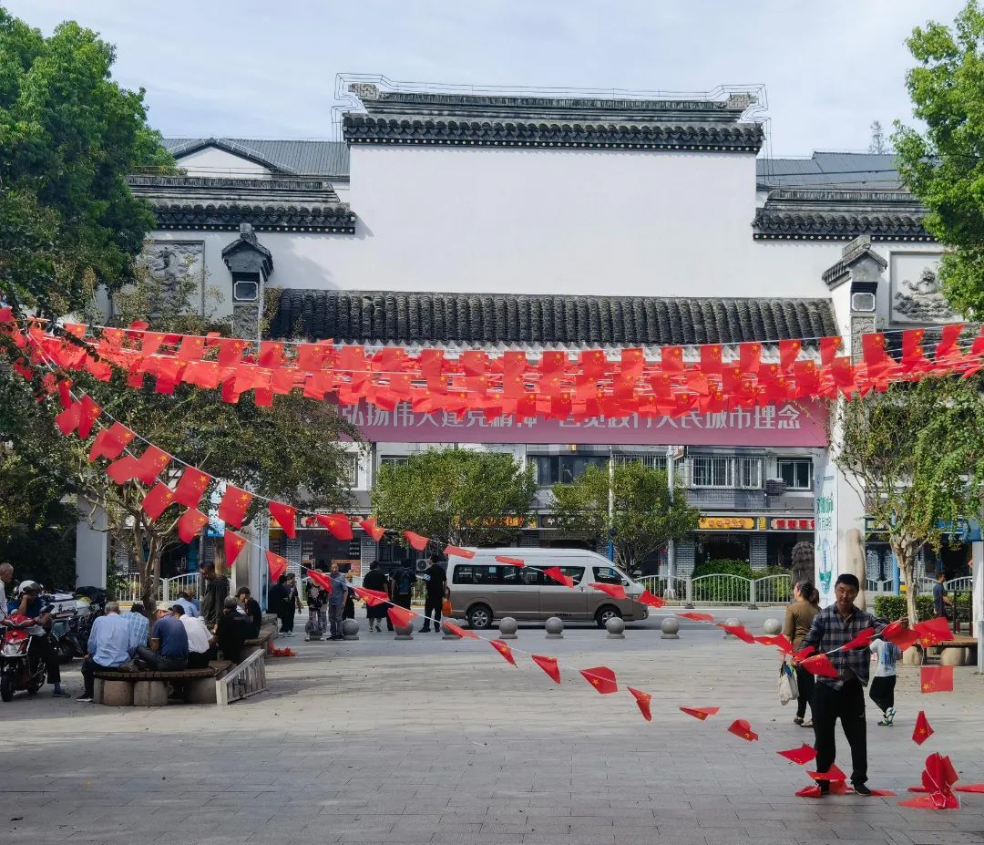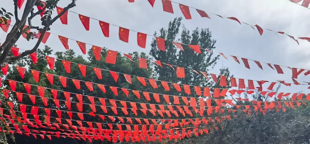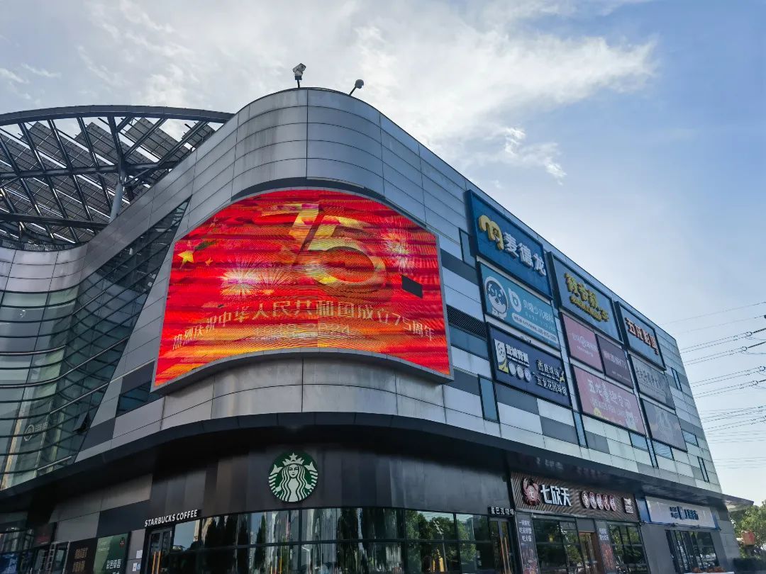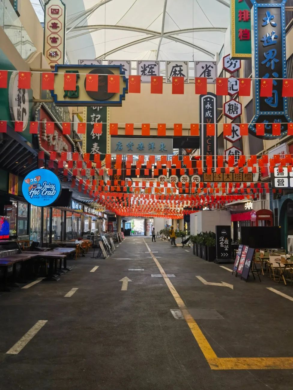 行走在大街上,路面两旁也排布了整齐的道旗。在五龙商业广场,电子大屏已然开启,并播放着国庆相关内容。马利来广场沿街商铺和内部中庭也已插上了多面国旗,挂起了灯笼,处处都是一片“中国红”。