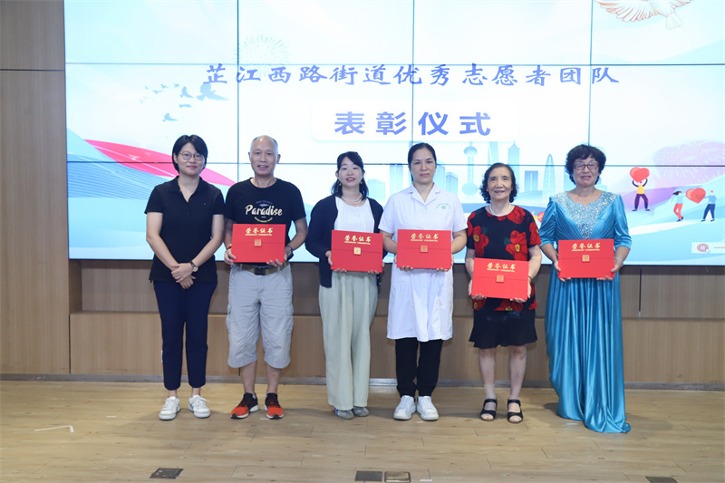 与会领导为芷江西路123弄“红色管家”党员巡逻队、永太“向日葵”全职妈妈团队、“七彩芷音”红色党员志愿者团队、“美·兴”志愿者服务团队、海城合唱团颁发“优秀志愿者团队”荣誉证书。