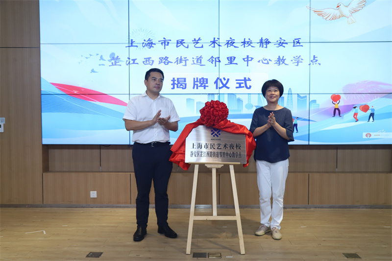 与会领导共同为“上海市民艺术夜校静安区芷江西路街道邻里中心教学点”揭牌,通过在芷江西路街道邻里中心教学点开设“唱上海老歌,走进淮剧梨园艺术”体验班课程,进一步传承淮剧艺术,促进剧种传播。