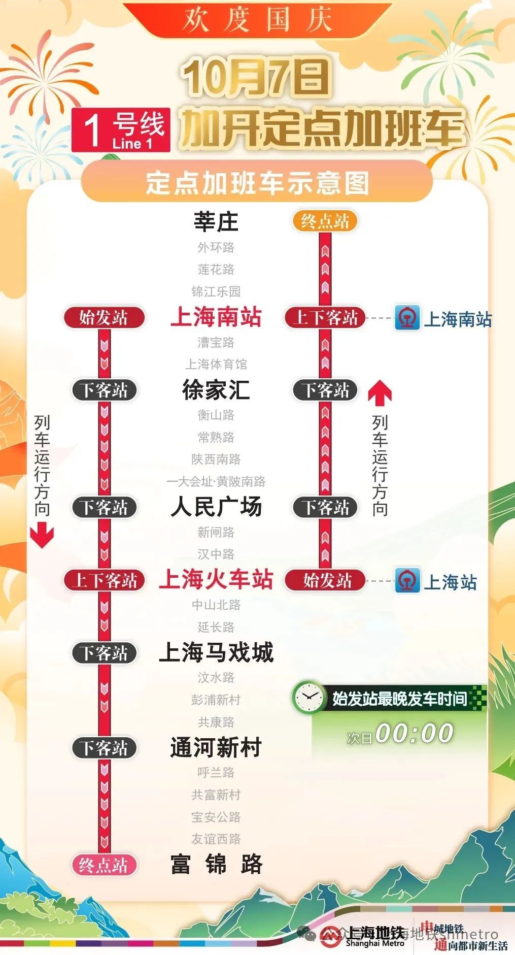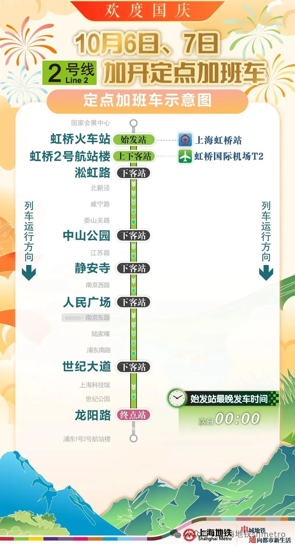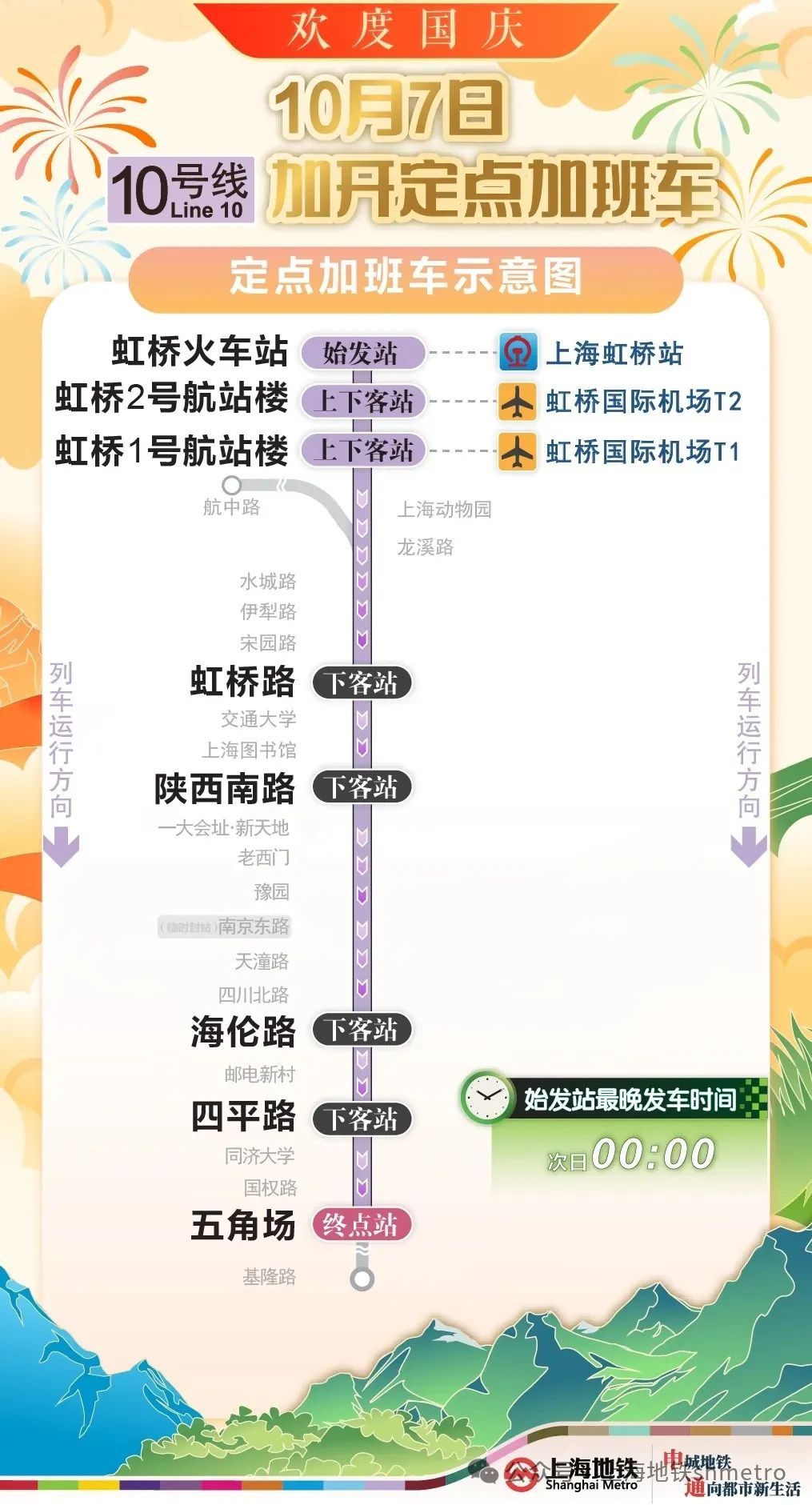 为提升国庆返程期间重要交通枢纽夜间疏散能力,根据计划,10月6日,地铁2、17号线将加开定点加班车;10月7日,地铁1、2、10、17号线也将加开定点加班车,末班车发车时间延长至次日0点,定点加开列车途经换乘站均暂停换乘服务。同时,地铁运营方还将密切关注虹桥枢纽夜间客流情况,根据现场客流需求或将进一步延长定点加班车开行时间。
