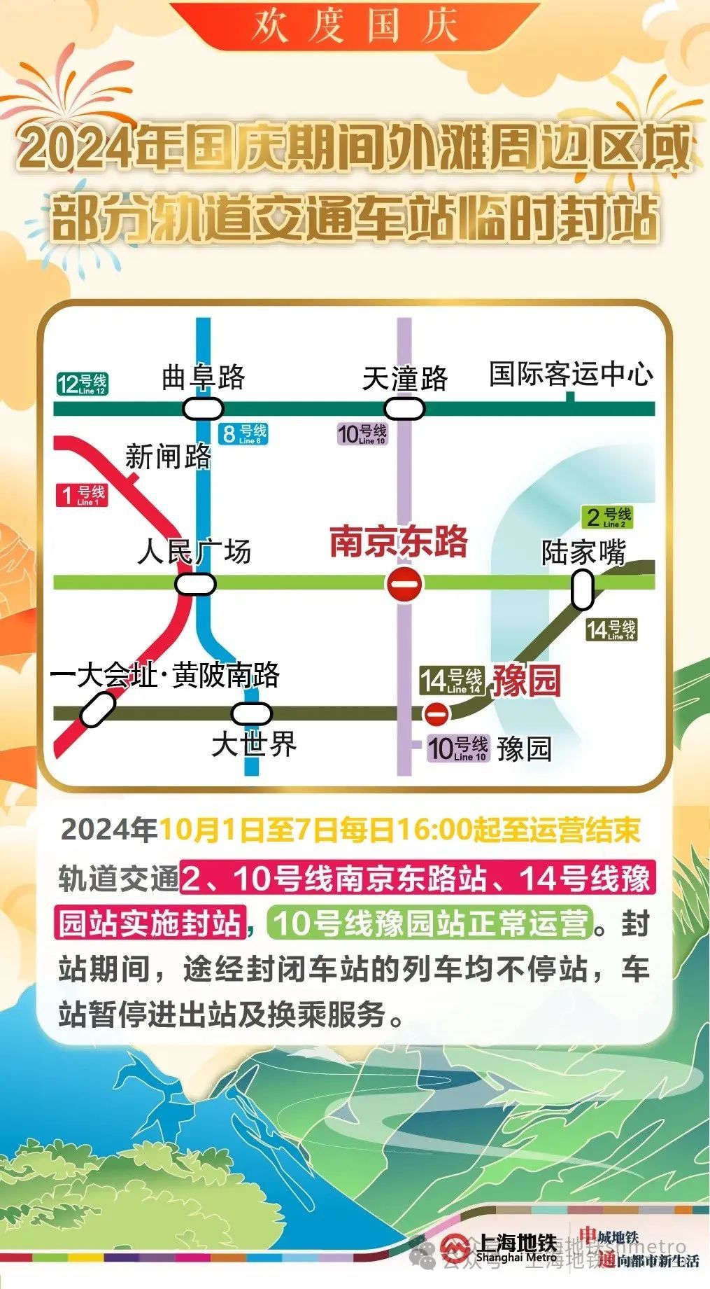 根据交通管制工作方案,10月1日至10月7日,每日16:00至运营结束,地铁2、10号线南京东路站,14号线豫园站计划实施封站。封站时段内在2、10号线南京东路站,14号线豫园站不能上下车,地铁站出入口也将关闭,乘客不能进出车站。
