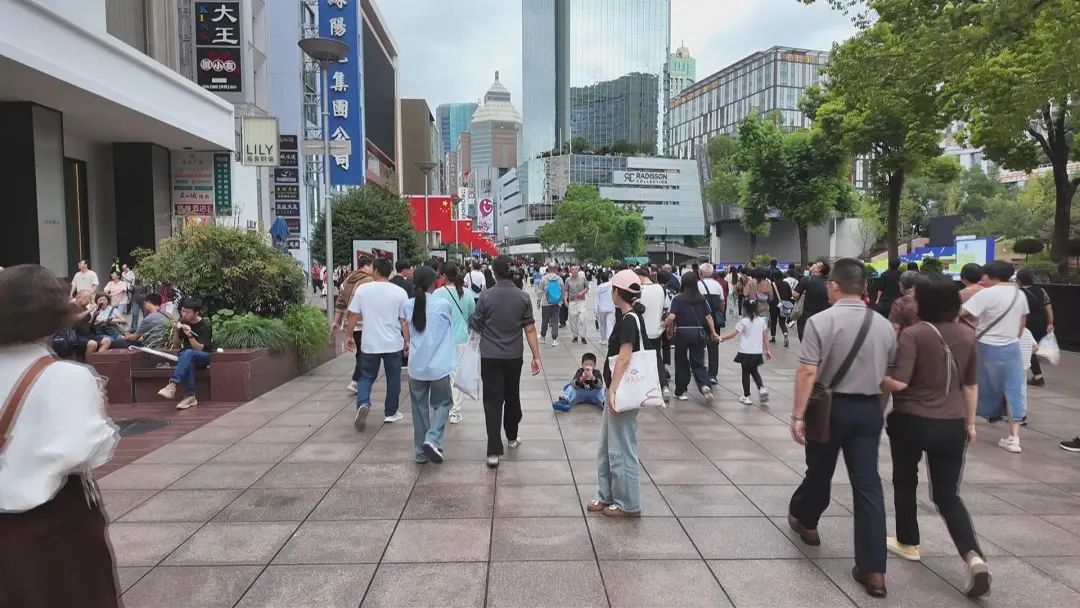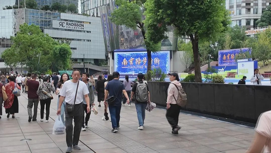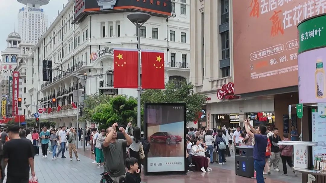 今天是国庆长假首日。虽天公虽然不作美,但南京路步行街上的人气依旧旺盛,不少市民游客举家出行,来到步行街上走走看看。步行街上红旗招展,两旁的商家也是布置了各种红色元素,行人们挥舞着手中的小红旗,节日气氛拉满。