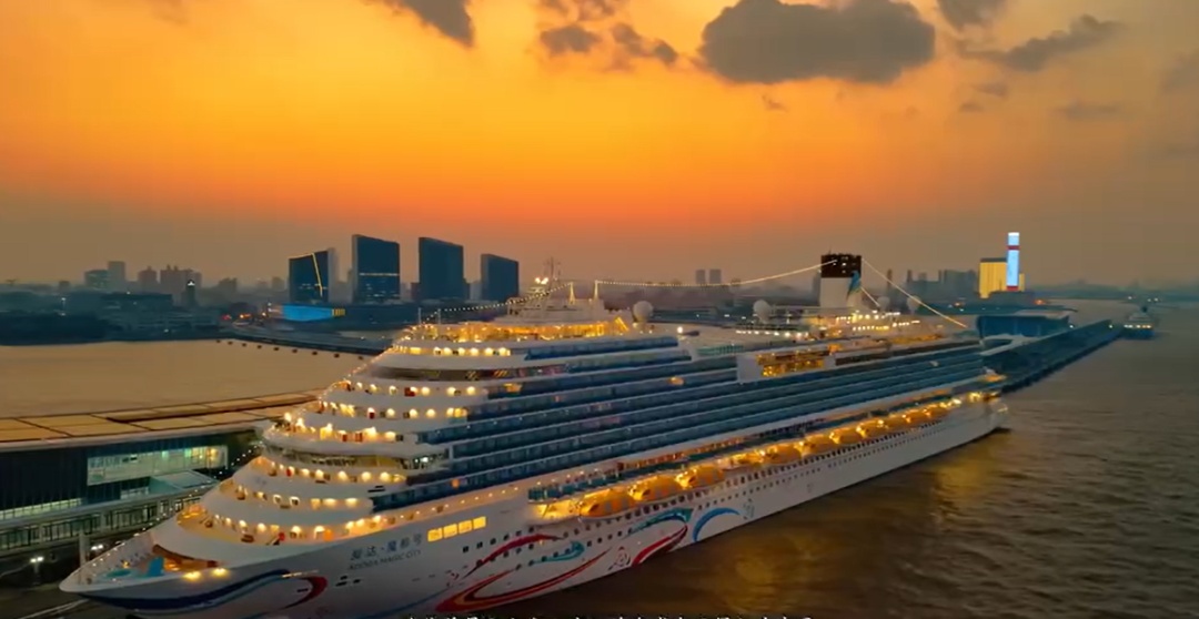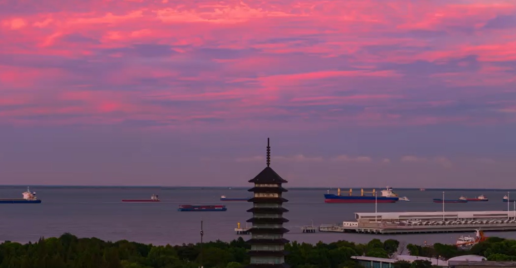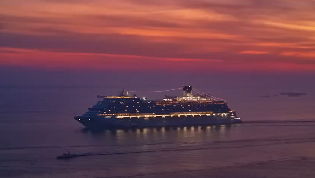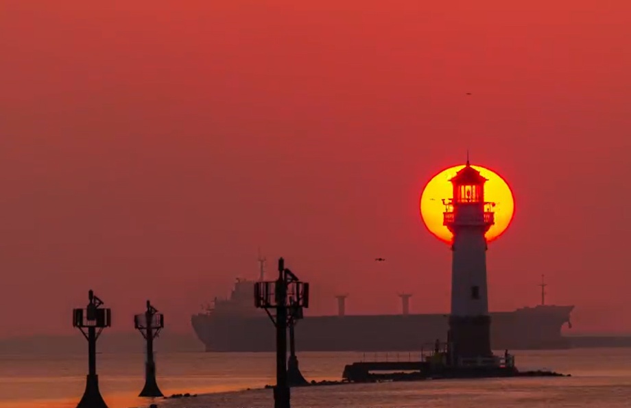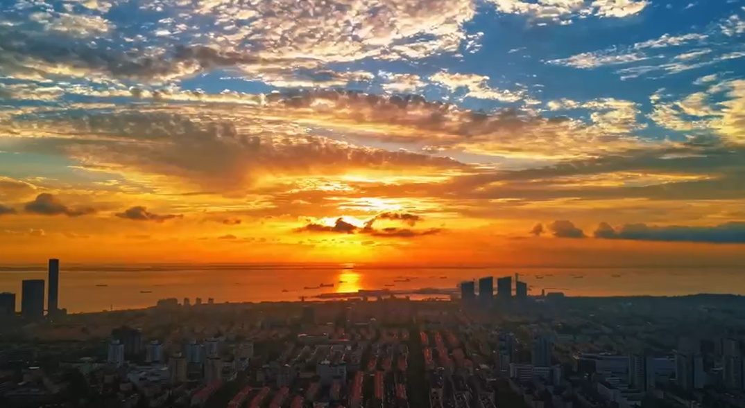 美丽的朝霞、飞翔的海鸥、归航的邮轮