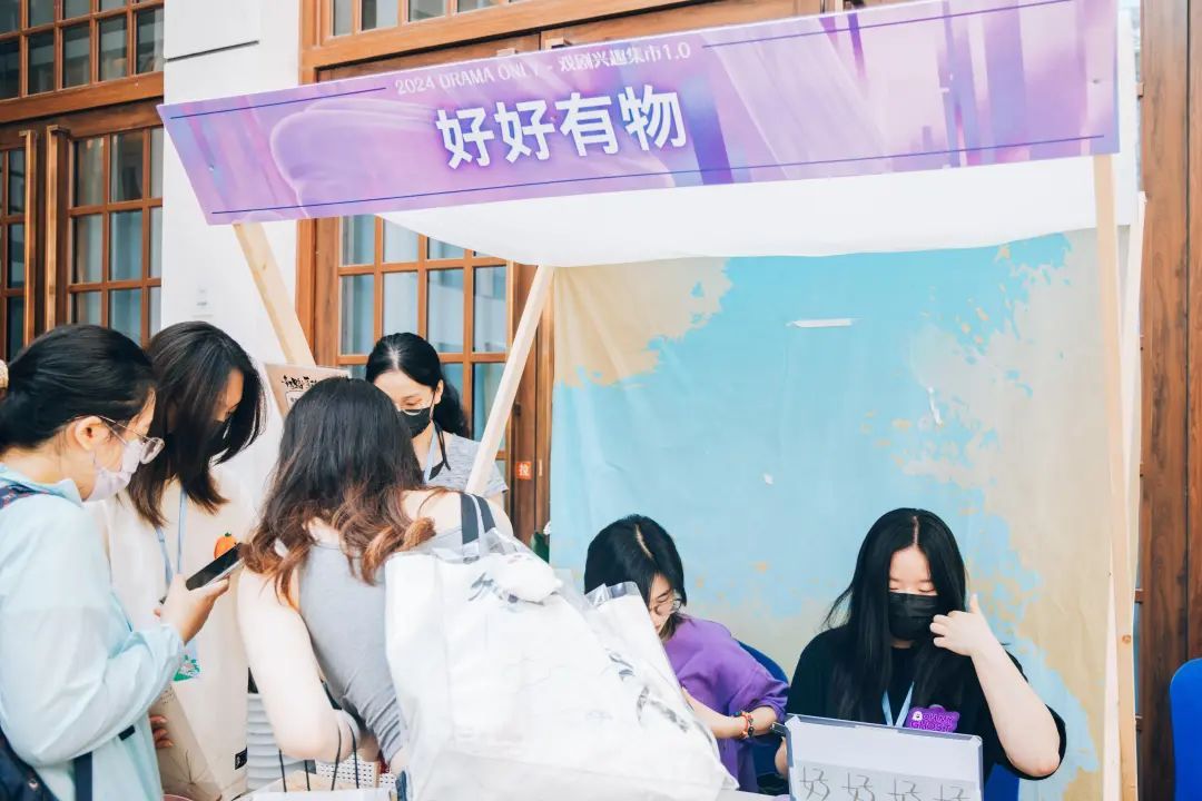 活动当日,14家官方特邀摊位和7大征集摊位共同亮相。前者由观众所熟知的多个戏剧厂牌和剧组主理出摊,后者则是通过线上征集报名的个人观众的爱好者摊位。集市上,特邀摊位各展诚意。除多场热门演出的优惠机制之外,也不乏官方周边的限时再贩和随机掉落。而更吸引人的,莫过于“一日店长”这一特别环节。在活动的每个时段内,都会有不同的演员轮流变身摊位店长,拉近与观众距离的同时提升他们的新鲜感与体验感。演员孙欣业、牟潇钰通过快闪演出方式实现新戏《【请输入剧名】》的演出预热,让观众们在现场抢先领略到这部百老汇吐槽音乐剧的精彩之处。