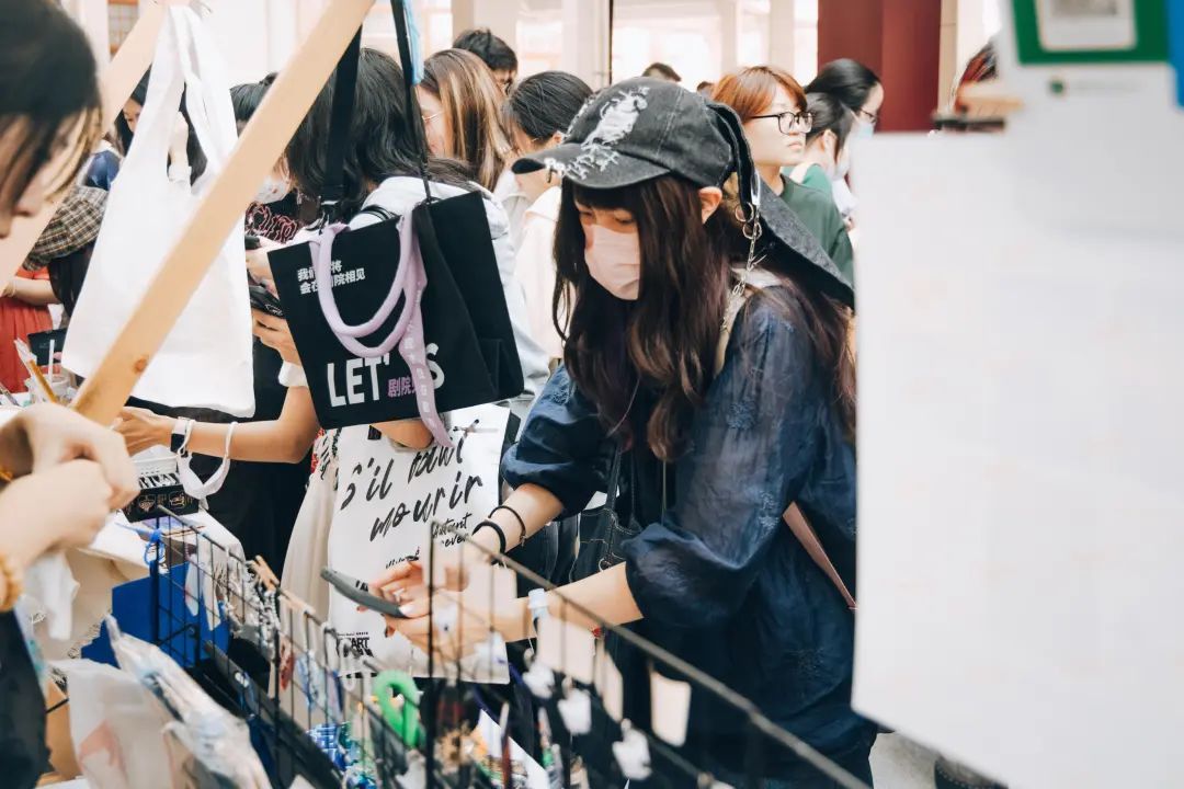 而从观众群体中征集而来的“野生”摊位则凭借兼具创意与实用性的原创周边也吸引了大批观众驻足。身为同好者,这些摊主们更了解观众们的普遍情绪和需求,基于此设计出表达观众心声的文创产品。对他们来说,物料不光是对戏剧、对剧场浓烈情感的载体,凝结着美好与闪光,更是和同好伙伴们分享快乐,互相温暖慰藉的一种存在。
