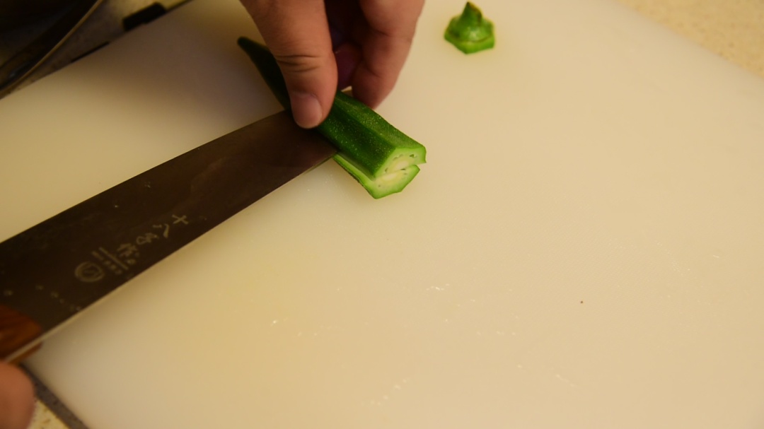1.撒入食盐对秋葵进行搓洗,秋葵去根对半开。