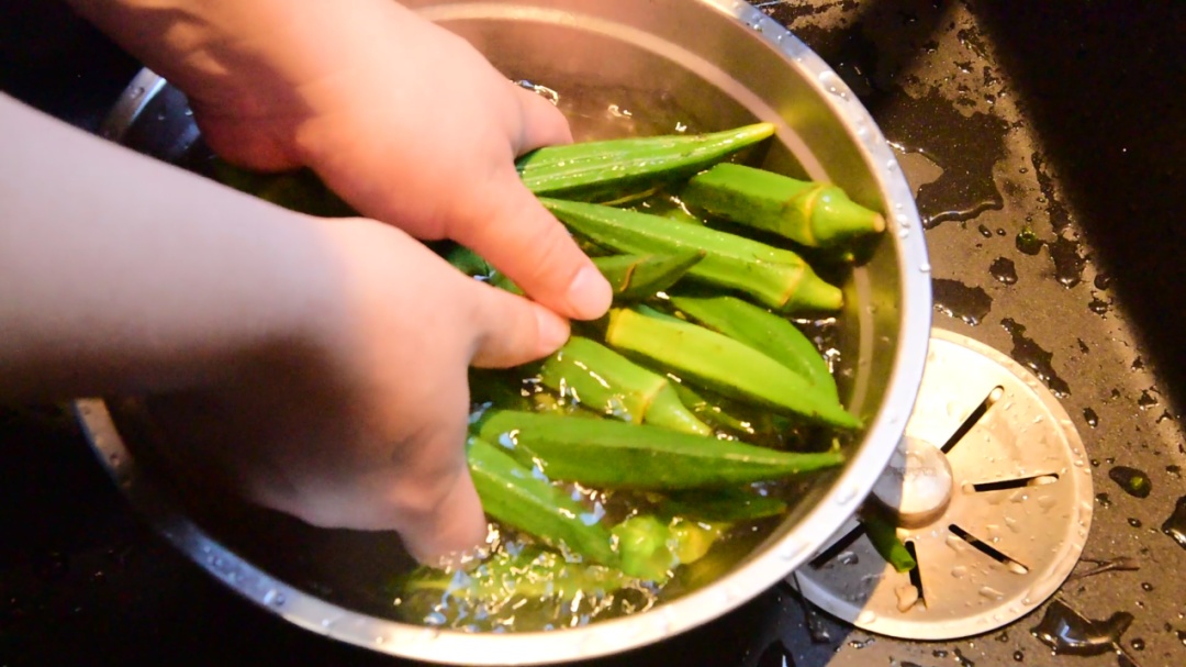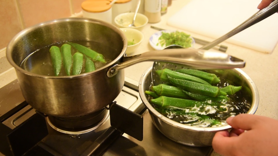 3.将秋葵进行汆烫1-2分钟,入冷水进行冲洗。