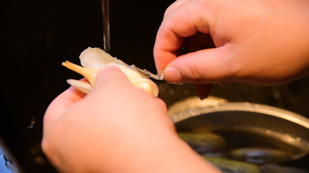 5.将蛏子捞出后洗净,去掉周边一圈的黑膜及残余泥沙。