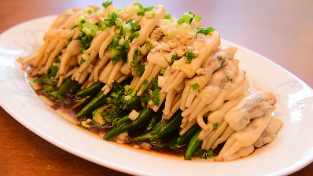 秋葵、蛏子、食用油、黄酒、食盐、葱姜、蒜末、白灼汁等