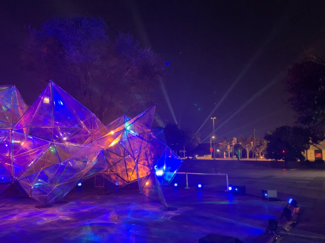 西岸艺术中心A馆的光影装置《光谱艺汇》,作为首届上海国际光影节闭幕式场馆的光影打卡点,以徐汇分会场的节展主题“光谱艺汇”为设计灵感,运用PVC幻彩膜材料的焦散属性展现七彩光谱的效果。利用灯光交替、颜色变换与音乐演绎,在夜晚沉浸式呈现“科技”“生命”“自然”三大主题,打造奇幻绚丽的光影梦境,让观众于光谱交融间自由徜徉。