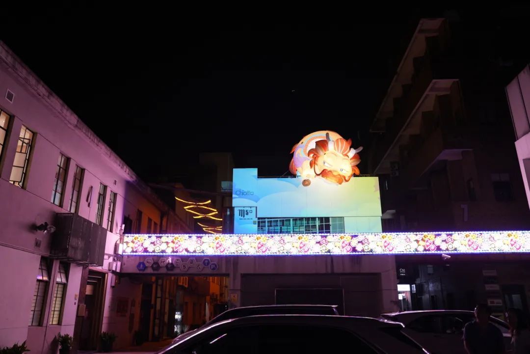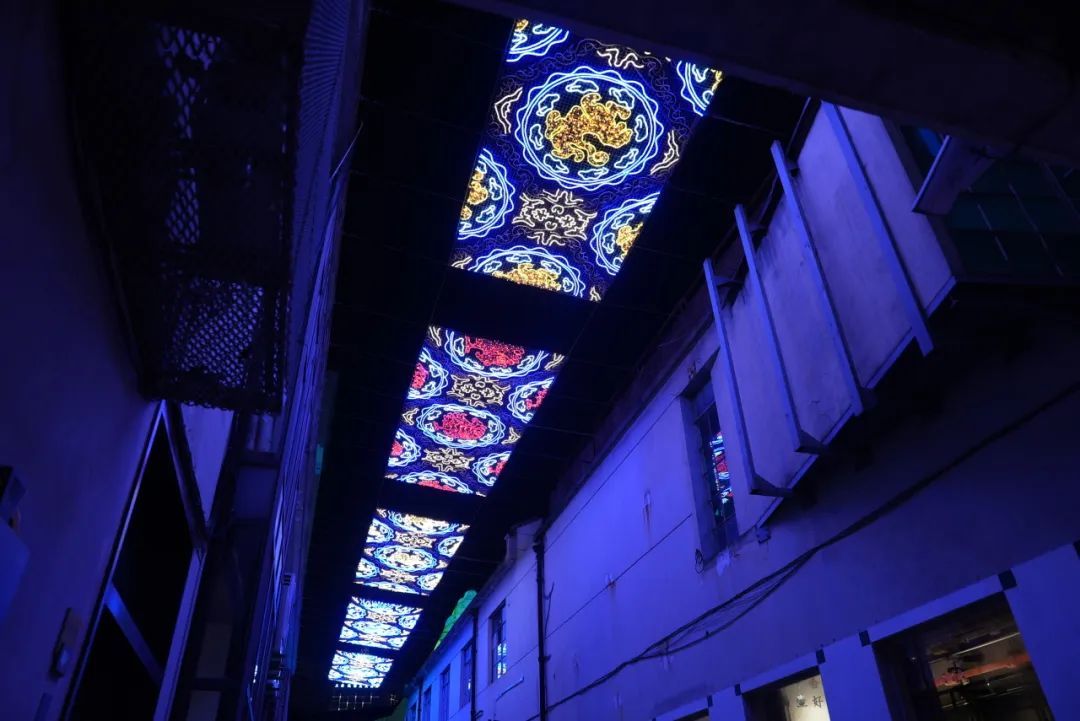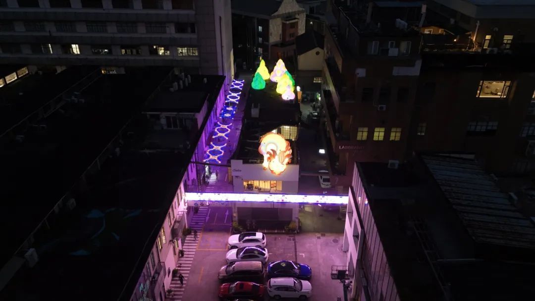 而在M50创意园内,14个创意装置被同时点亮,这也是普陀区创意装置最密集的节点。这些装置依据信和纱厂旧址细节改造,通过织锦工艺结合现代艺术,弘扬中华文明的文艺创新。从空中俯瞰,炫彩的灯光投影在地面,将园区打造得摩登又现代;一旁,一个立体的光影装置灵感来自于古老的老场坊墙壁上茂盛的爬山虎,灯带从墙壁延伸出来,在夜空中闪闪发光;一只憨态可掬的中国龙也盘踞在园区老厂房,墙壁上投射着云卷云舒,人们行走其间,抬头仰望,如同置身于琼楼玉宇之内……灯光艺术、雕塑艺术、气膜艺术、夜光涂鸦艺术等多种形式,在M50呈现“光影”与“艺术”的碰撞。