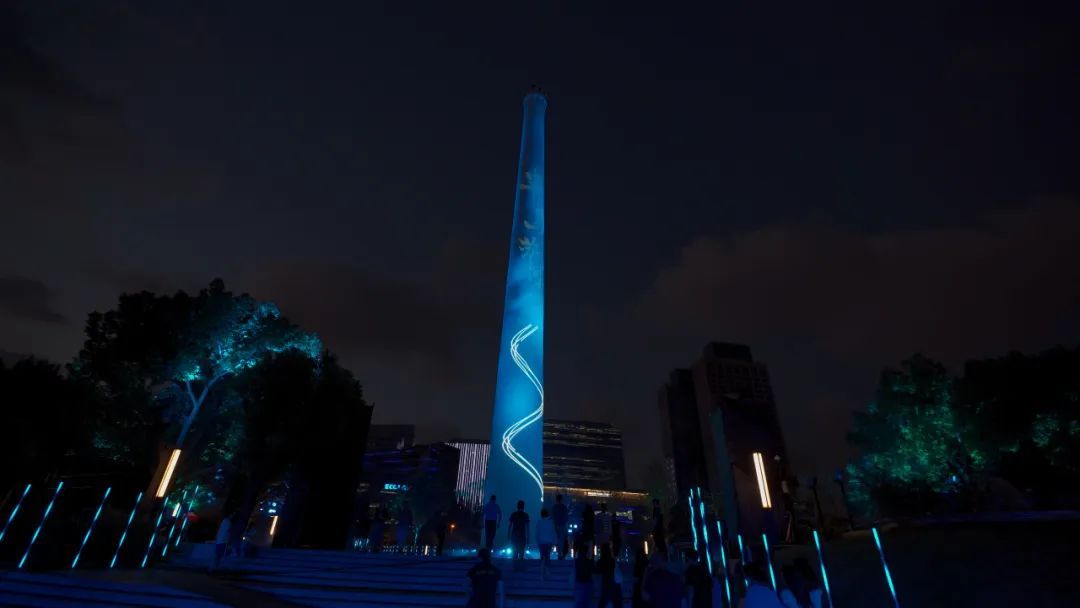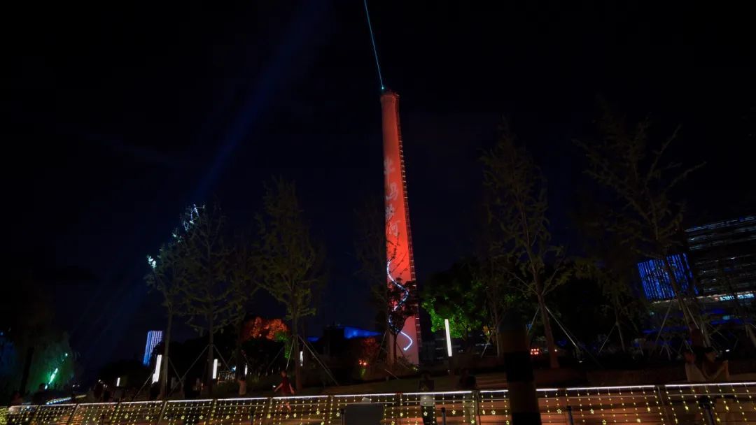 晚上7点整,在公园标志性的工业遗迹,原上海试剂总厂62米高的巨型烟囱处,层层天梯逐节亮起至烟囱顶端,染色灯将灯柱染成红色,星星点点的光影投射在地面,巧妙融合了普陀区的红色文化、工业历史与现代化城市风貌。天梯灯光全部点亮后,烟囱底部和苏州河游船长风公园码头舞台灯随之点亮,党群服务中心屋顶灯光秀启动,巧妙融合了传统文化与现代科技,视觉效果颇为震撼。