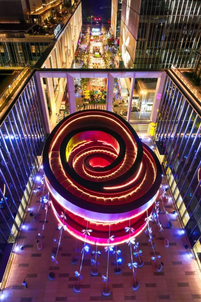联动首届上海国际光影节,前滩公园巷携手4位国内外艺术家及团队,将蝴蝶及植物元素交融现代光影技术融入街区。红色巨型双螺旋塔“无尽之旋”华丽变装,翩翩蝴群沿装置曲度飞旋而上;地面投影将温柔的水纹、美丽的花瓣与飞舞的蝴蝶播撒在街区步道之上,一步一景,如梦如幻。