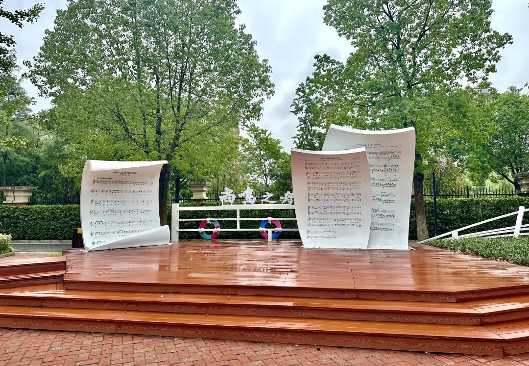 吴金瑜的办公室位于教学楼内,推开门,他便能看到教室里孩子们学习的身影,而向楼下望去,能看到一个由他亲自设计的名为“尚鸣之舟”的小舞台,寓意着孩子们的思想在校园中自由地表达与绽放。舞台上三个乐谱形状的雕塑分别刻着中华人民共和国国歌、上闵外校歌和舒伯特的《小夜曲》,吴金瑜笑着说:“我希望孩子们心里有祖国、有母校,也有一方自己的小天地。”