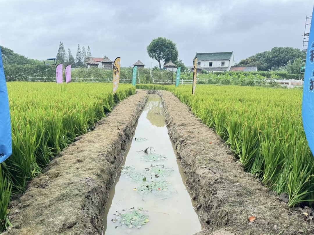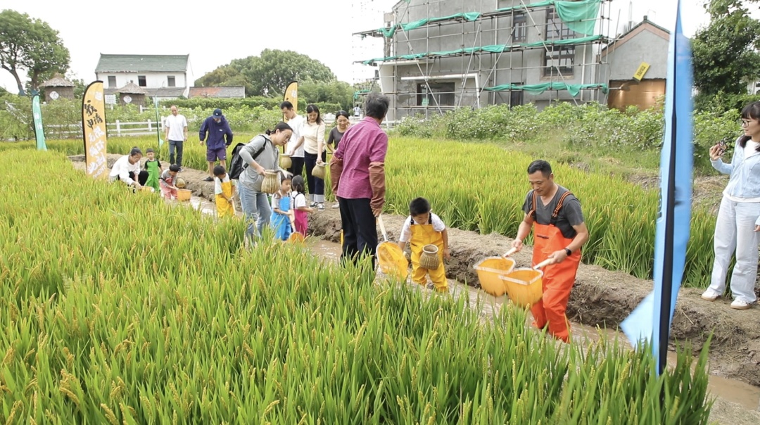 10月1日上午,在山阳田园民宿街旁,整片的稻田黄绿相间,稻穗在微风中泛起稻浪。孩子们穿上下水裤和雨靴,背上鱼篓,一个接着一个冲进稻田水沟里,在工作人员的指导下,尝试在泥水里捕鱼。