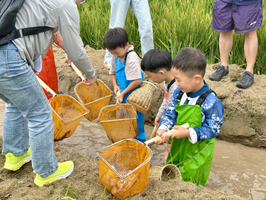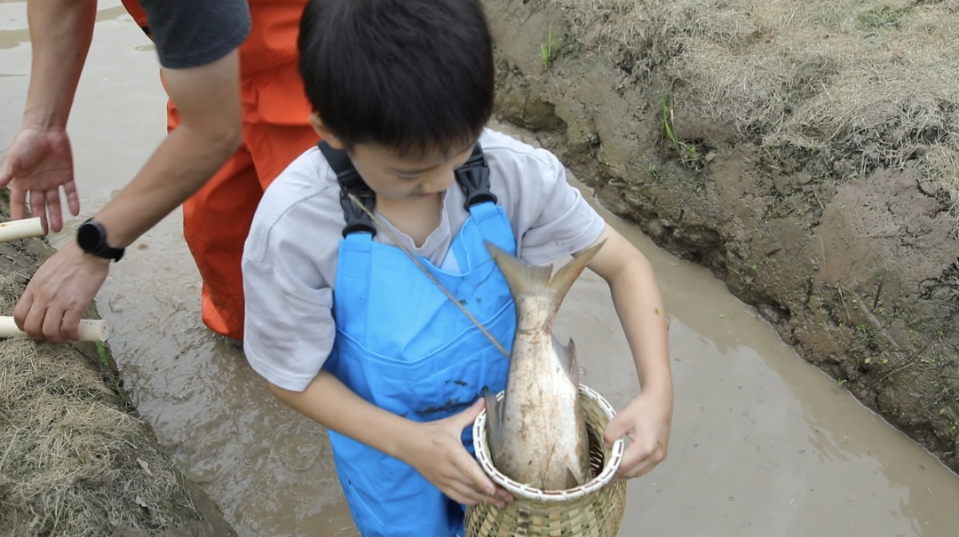 秋高气爽鱼儿肥,充满趣味的捕鱼活动让不少小朋友直呼过瘾。家长们则走在田埂上,当起了孩子们的助手,在充满默契的配合下,不少亲子家庭都收获颇丰。