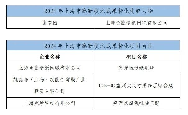 近日,“2024上海高新技术成果转化百佳表彰会”在大零号湾科创大厦会议中心举行。金山区3个项目获评“2024年上海市高新技术成果转化项目百佳”,上海金熊造纸网毯有限公司总经理谢宗国荣获“2024年上海市高新技术成果转化先锋人物”荣誉称号。