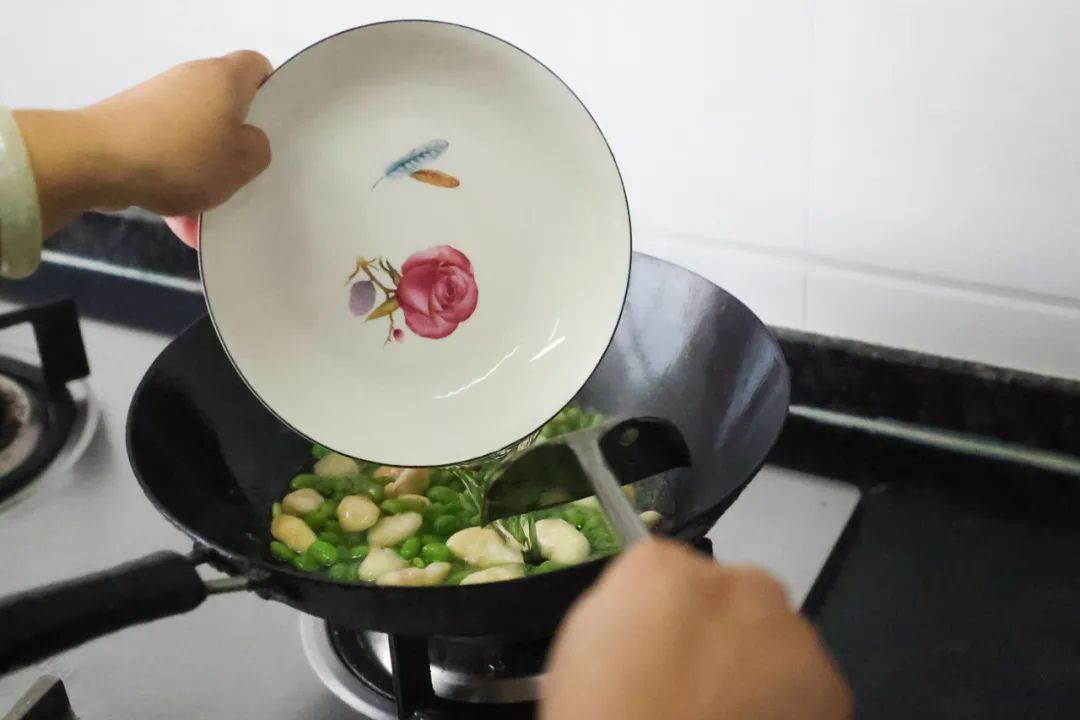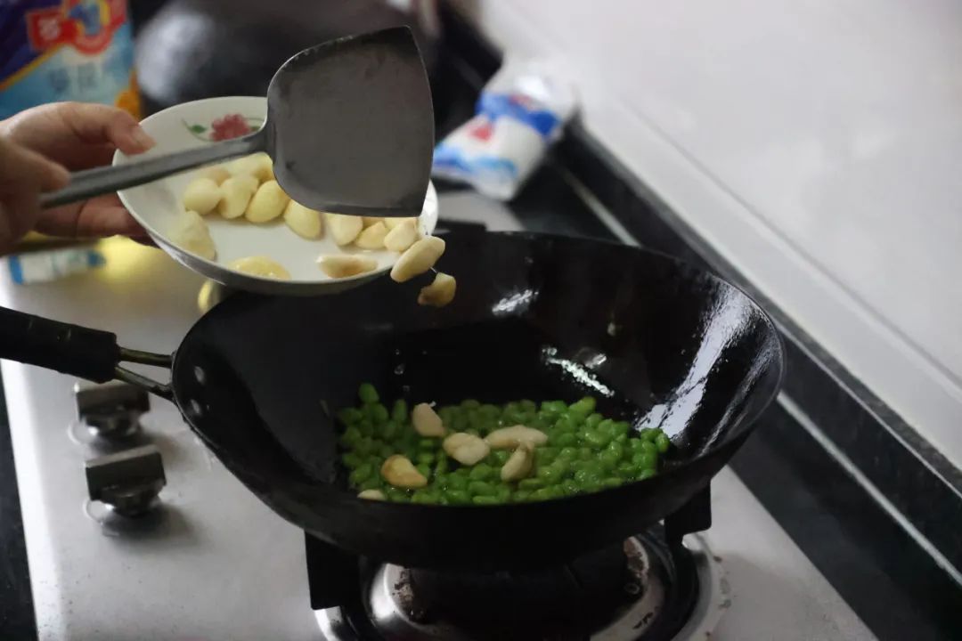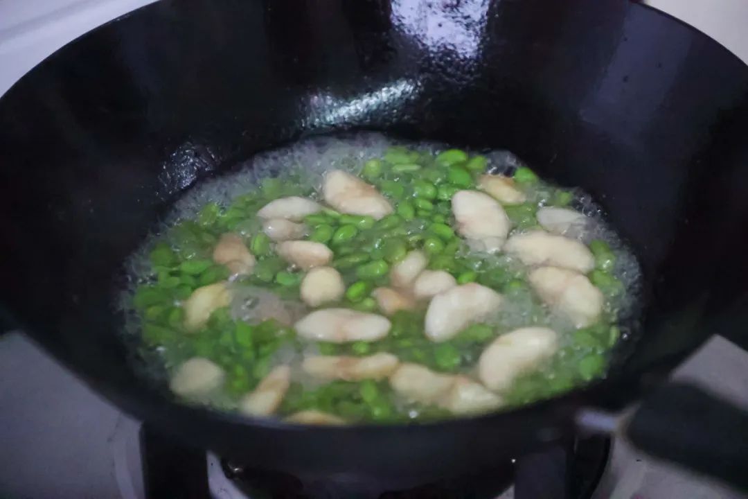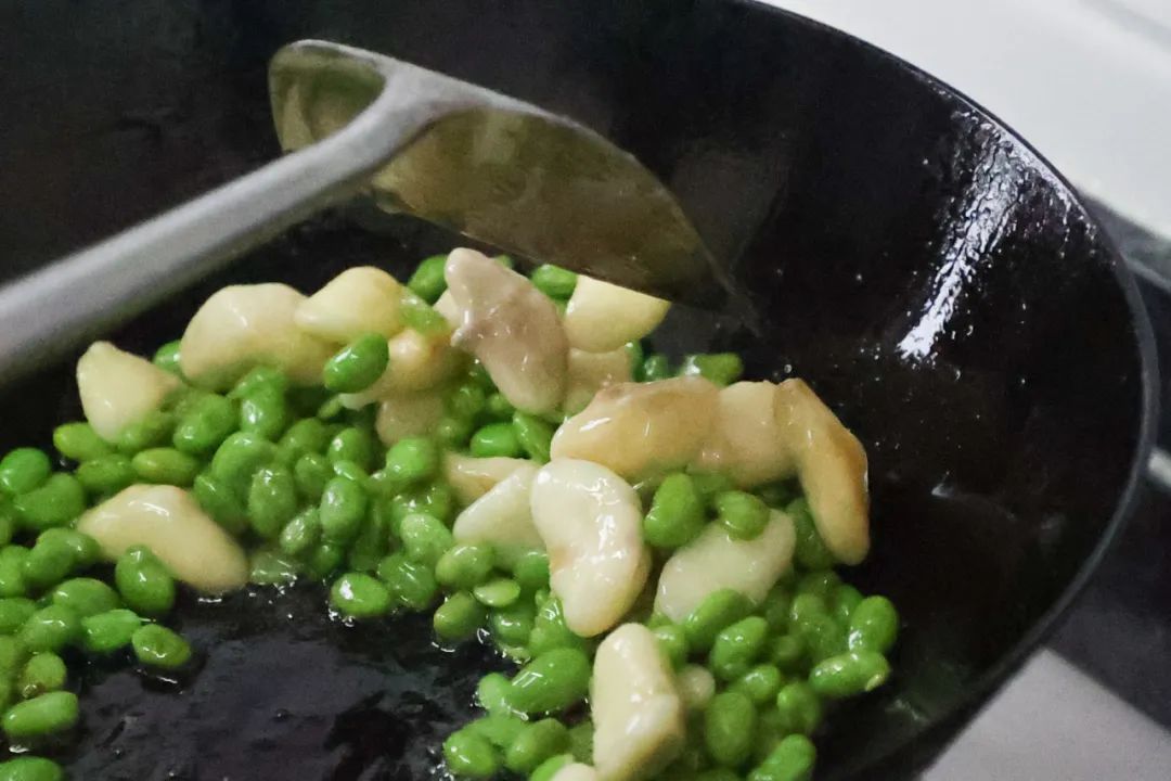 起锅烧油,加入毛豆进行翻炒,随即倒入菱角,放少许盐,一直炒至食材清香溢出。随后倒入少量清水,保证锅底少许汤水,这样容易熟且不会呈焦黄色。