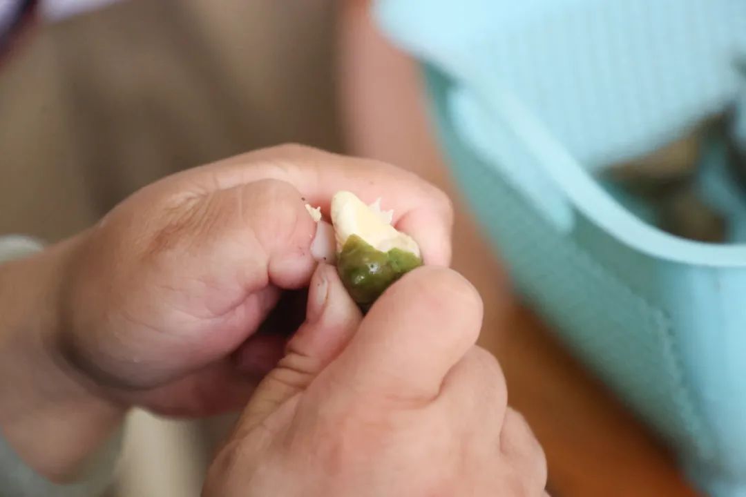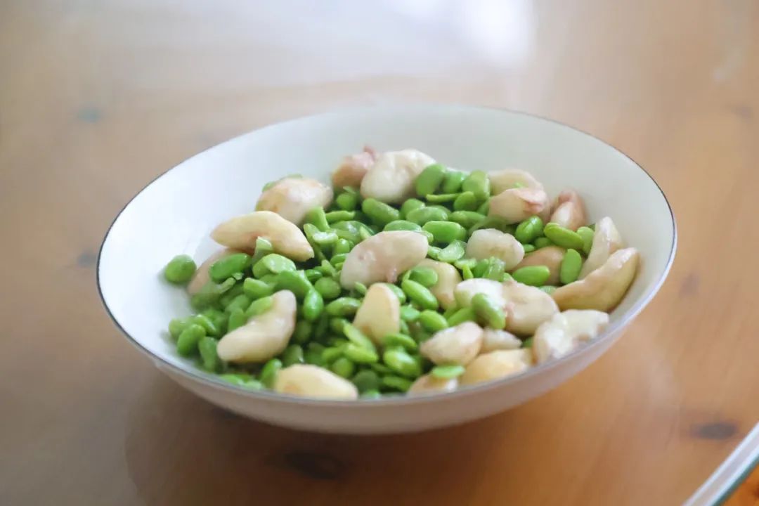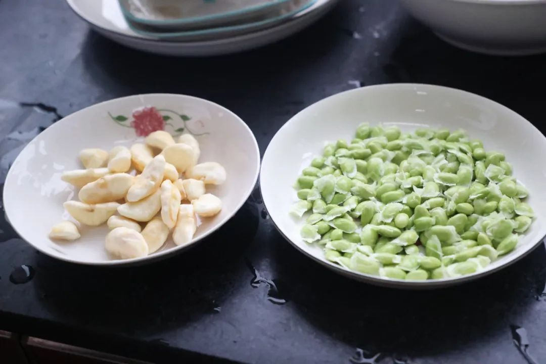 从田间收获毛豆后,剥去外壳,即可见其翠绿色的豆粒。随后把刚成熟的菱角洗净,剥开坚硬的外壳,新鲜的菱角剥壳比较困难,可以在菱的两个角上划上一刀,这样就方便壳肉分离了。