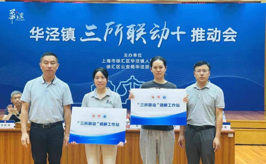 为了进一步强化“三所联动+”工作,调解站下沉至华泾镇南北两个警务站,推进会现场还举行了“三所联动+”工作站的授牌仪式。全体来宾参观了新落成的华泾镇“三所联动+”调解工作室,共同见证了这一创新机制的成果。