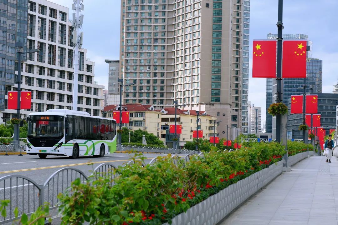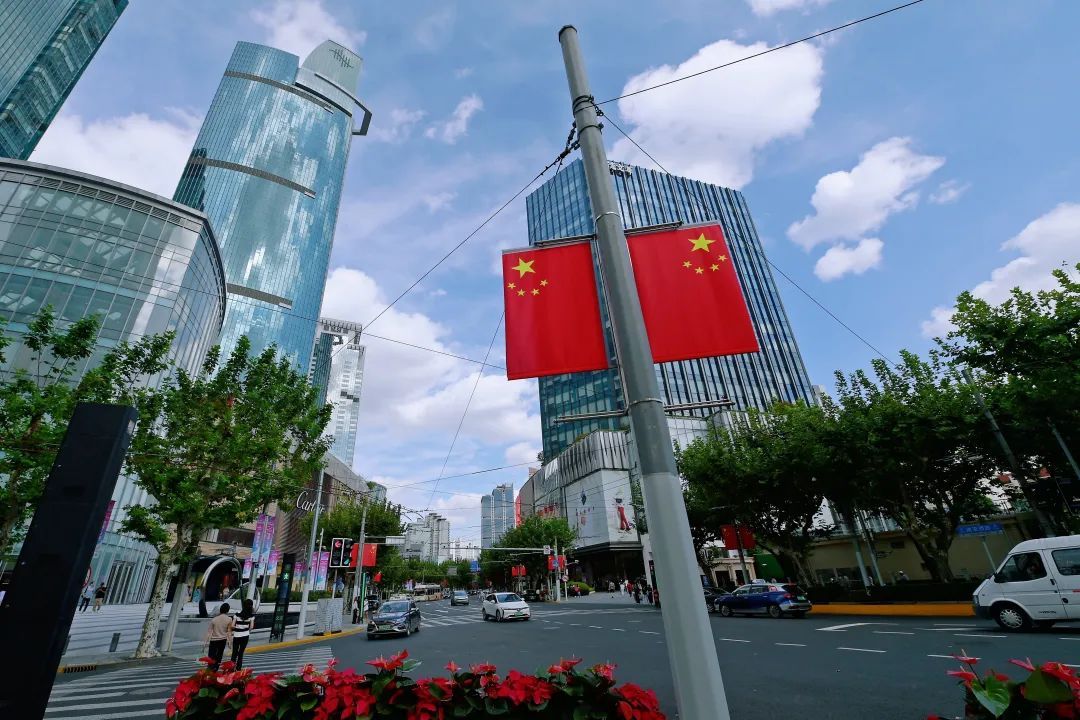国庆佳节至,静安绘新貌。五星红旗迎风舞,每一面都是对祖国的深情颂歌,飘扬在蓝天之下,诉说着不朽的传奇。