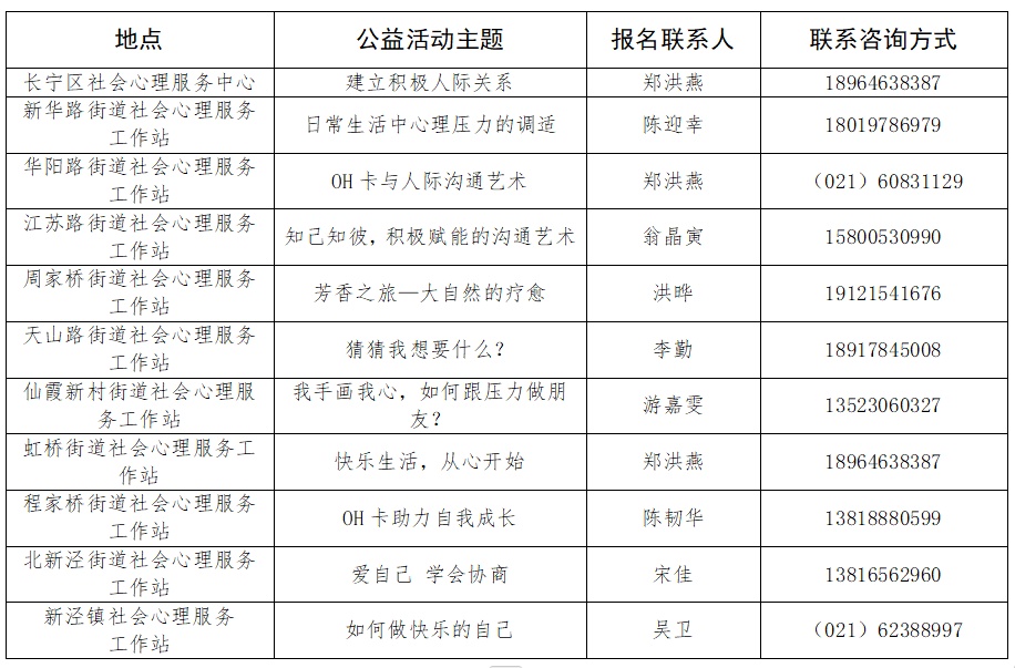 10月份里,长宁各部门、街镇将因地制宜、精心谋划,把更有品质、更具特色的宣传服务活动送进社区、送到居民身边。而区社会心理服务中心、各街镇社会心理服务工作站也精心准备了主题各异的特色活动,期待大家的参与。都有哪些活动?一起先睹为快!
